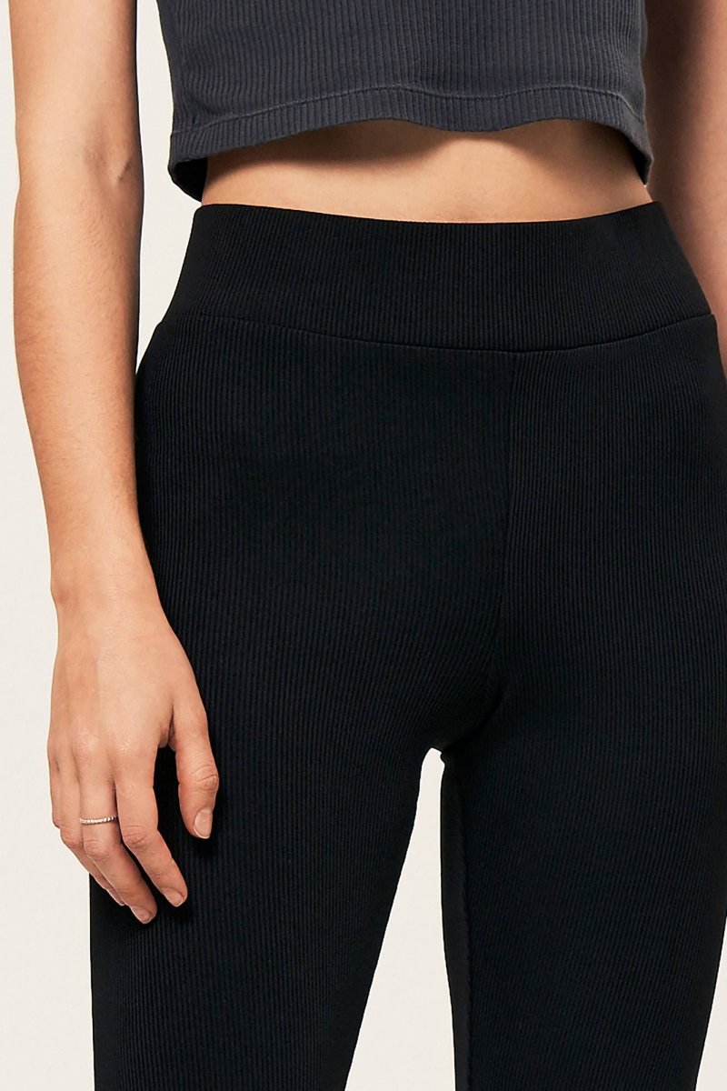 Эластичные леггинсы со штрипкой, на широком поясе с резинкой. Выполнены из утепленной ткани в рубчик.
