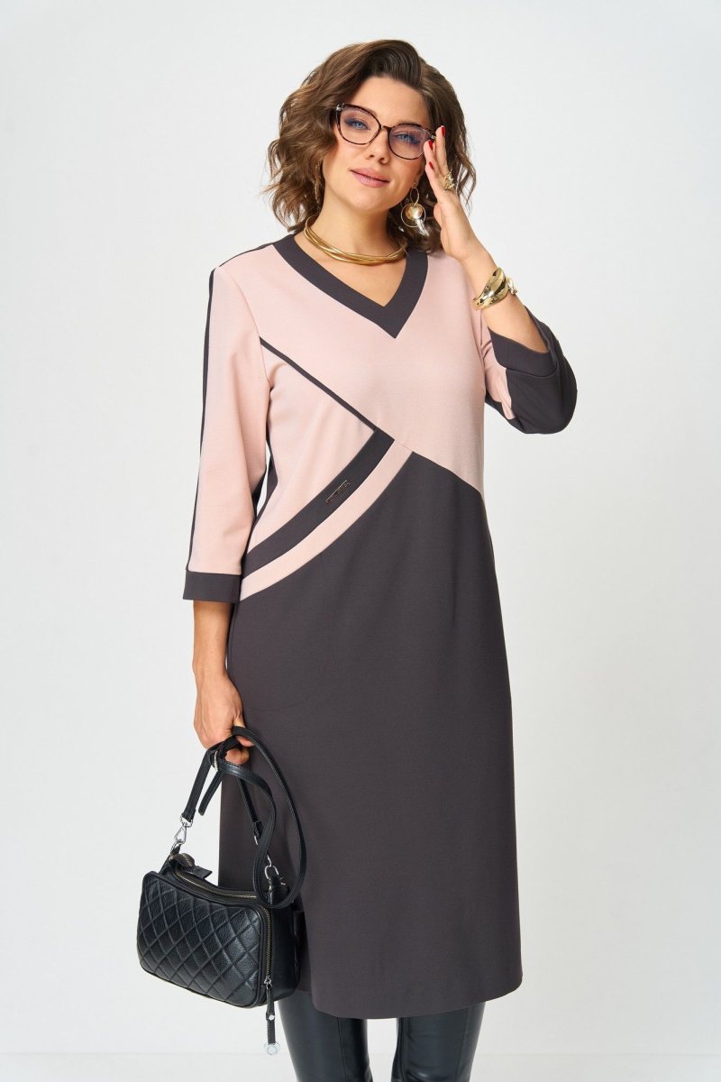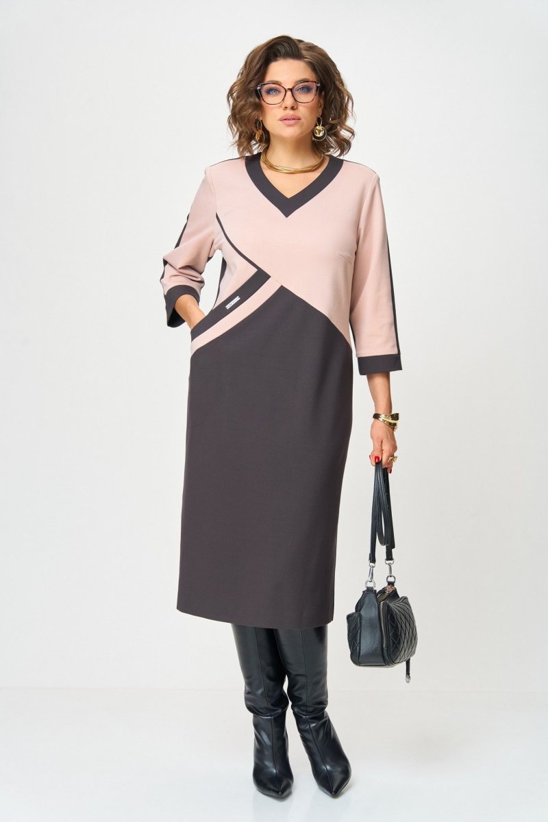 Это платье создано для женщины, которая ценит простоту и выразительность в каждой детали. Геометрический крой с диагональной вставкой не только привлекает внимание, но и визуально стройнит фигуру, создавая гармоничные линии силуэта. Платье прямого кроя длины - миди из трикотажного полотна. Горловина V-образной формы с контрастной отделкой, По переду ассиметричный карман, Рукав длиной 3/4 с манжетой по низу. Спинка со средним швом без особенностей, в правом боковом шве разрез. Мягкий пудрово-розовый оттенок верха красиво сочетается с глубоким шоколадным низом, подчеркивая изысканность и современный характер модели. Контрастная отделка добавляет динамики, а удобный крой позволяет чувствовать себя уверенно в течение всего дня.