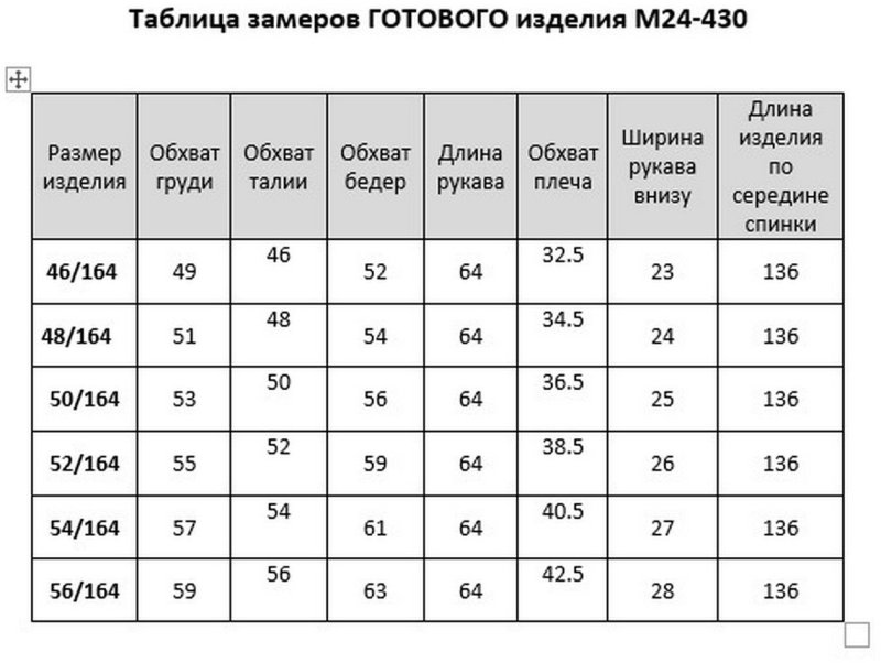 Таблица размеров