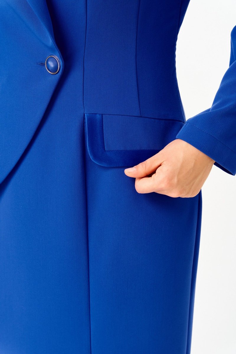 Платье полуприлегающего силуэта, длиной за колено, выполнено из однотонной ткани. В качестве отделки использована однотонная ткань с атласным эффектом. Полочка платья с вертикальными рельефами и ассиметричной отлетной правой частью, с двубортной застежкой на петли и пуговицы. По бочкам обработаны декоративные клапаны. Горловина V-образной формы с отложными лацканами и воротником . Спинка платья со средним швом и вертикальными рельефами. В левом боковом шве обработана потайная молния. В нижней части полочки, с правой стороны в рельефе обработан разрез. Рукав втачной, двухшовный, длинный. Платье на плечиках.