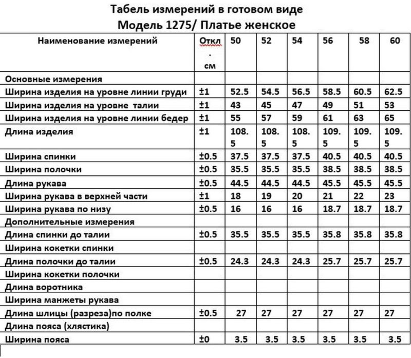 Таблица размеров