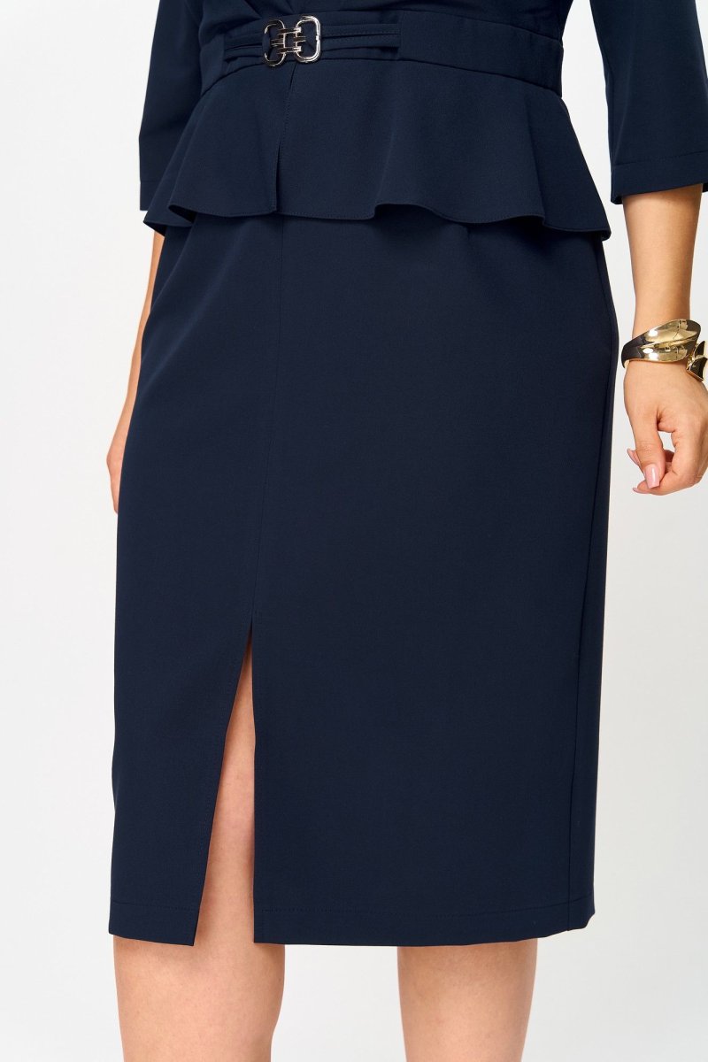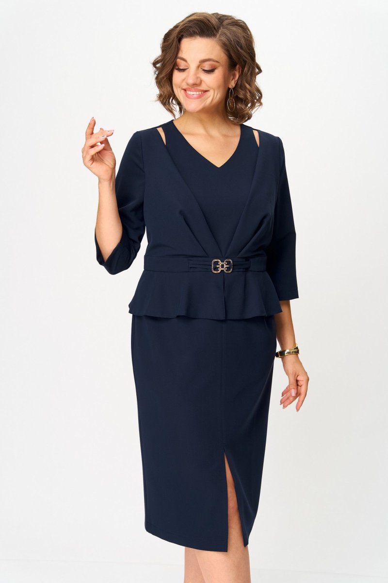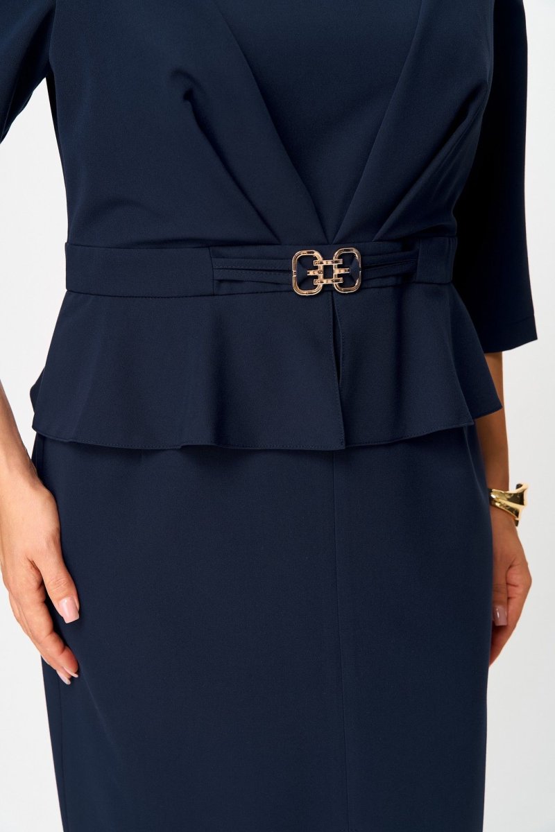 Платье с отрезным лифом, полочка лифа с рельефами, горловиной V-образной формы и отлетной частью полочки со складкой по шву притачивания к поясу. Спинка лифа с вертикальными рельефами и центральным швом с потайной молнией. Юбка платья прилегающая по бедрам с талиевыми вытачками и разрезом в среднем шве передней половинки юбки. Между лифом и юбкой обработан пояс с декоративным элементом в виде пряжки и баской.