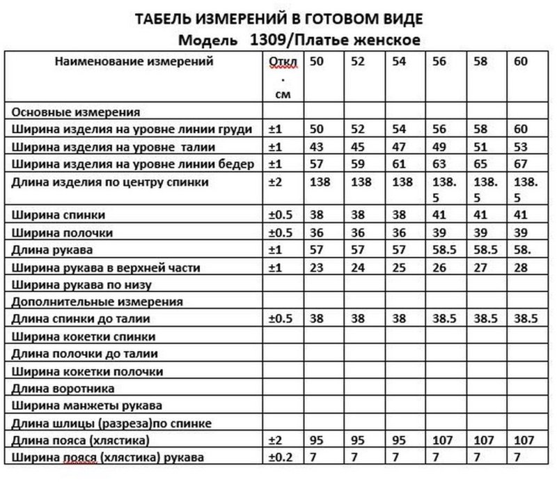 Таблица размеров