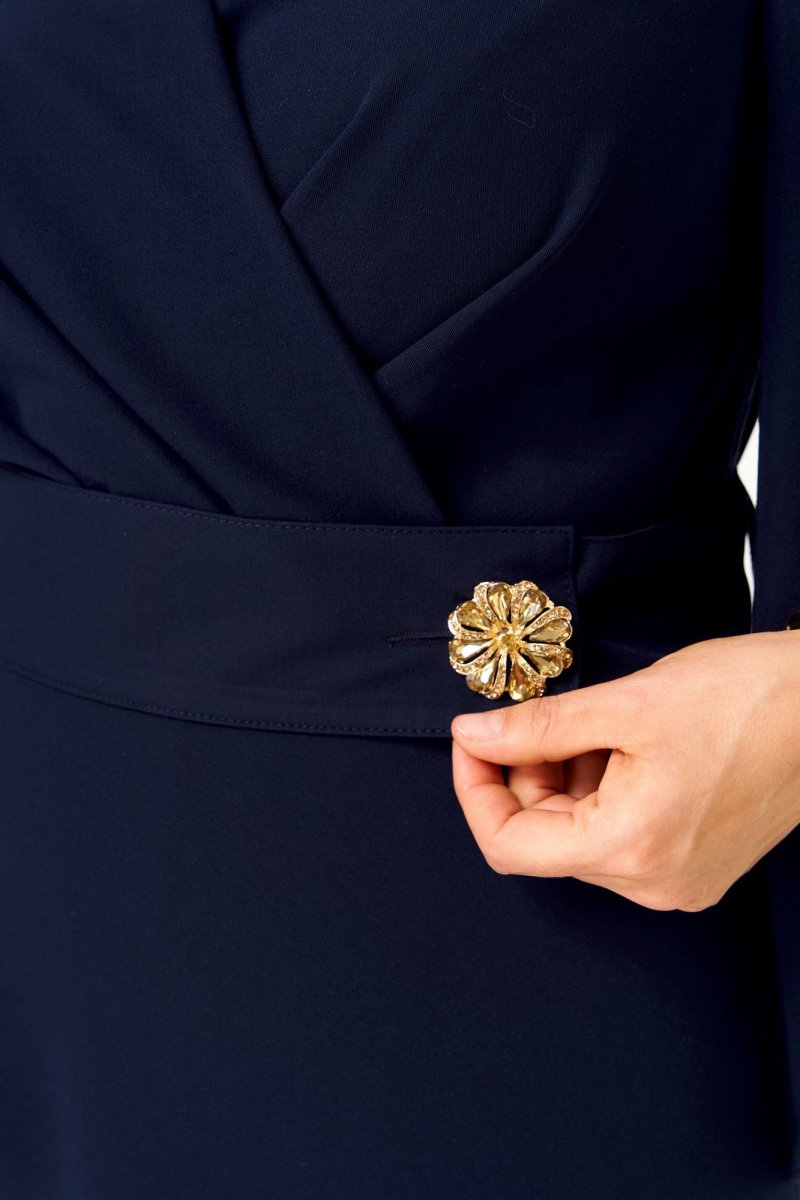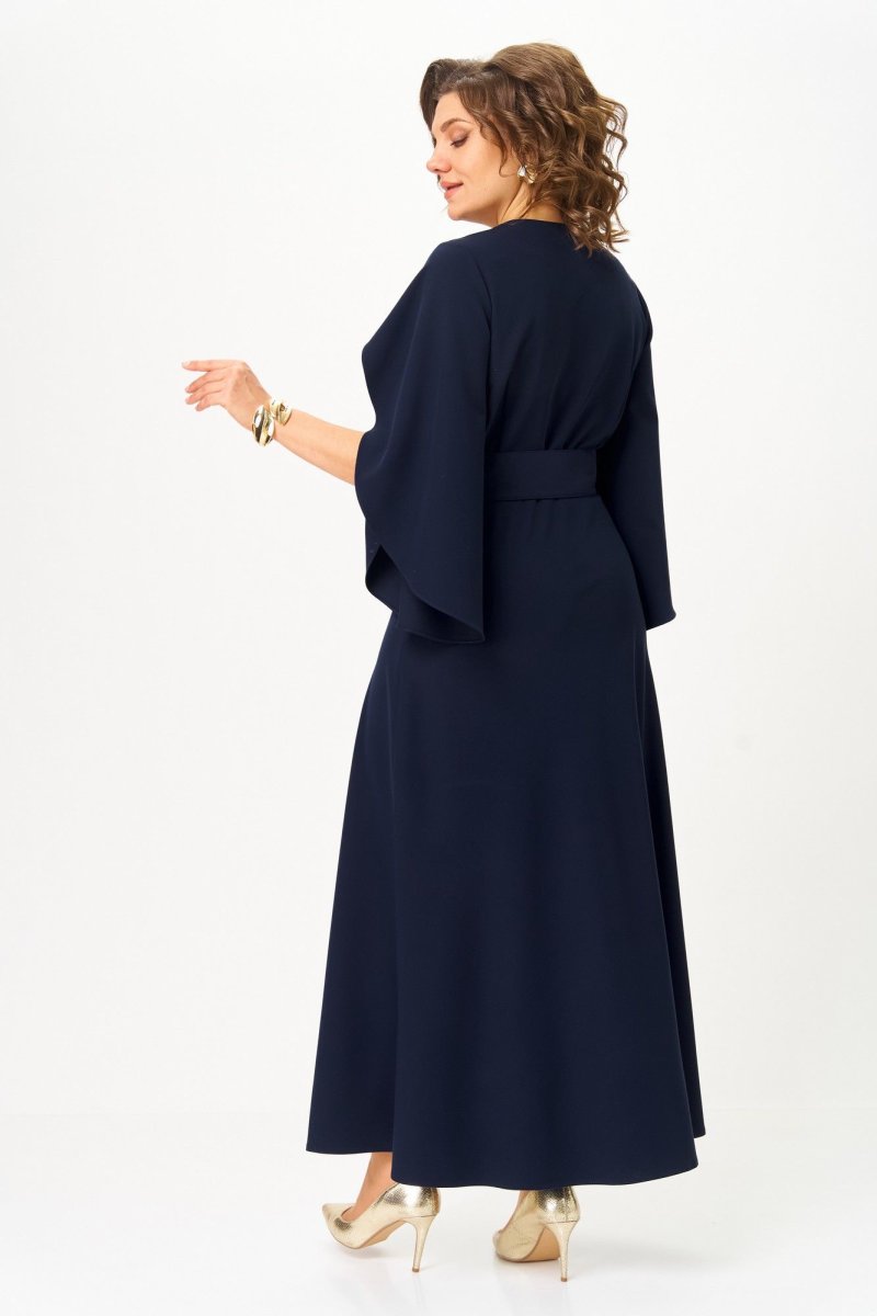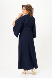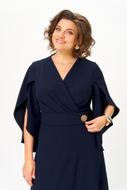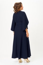 Платье отрезное по линии талии. Полочка с иммитацией запаха и складками по линии талии. Горловина V-образной формы. Спинка с талиевыми вытачками. Рукав втачной, обьемный к низу, с драпировкой. Юбка полуприлегающая по бедрам, свободная и широкая по низу. По боковым швам в области талии настрочены шлевки, через которые продет пояс, крепящийся на пуговицу.