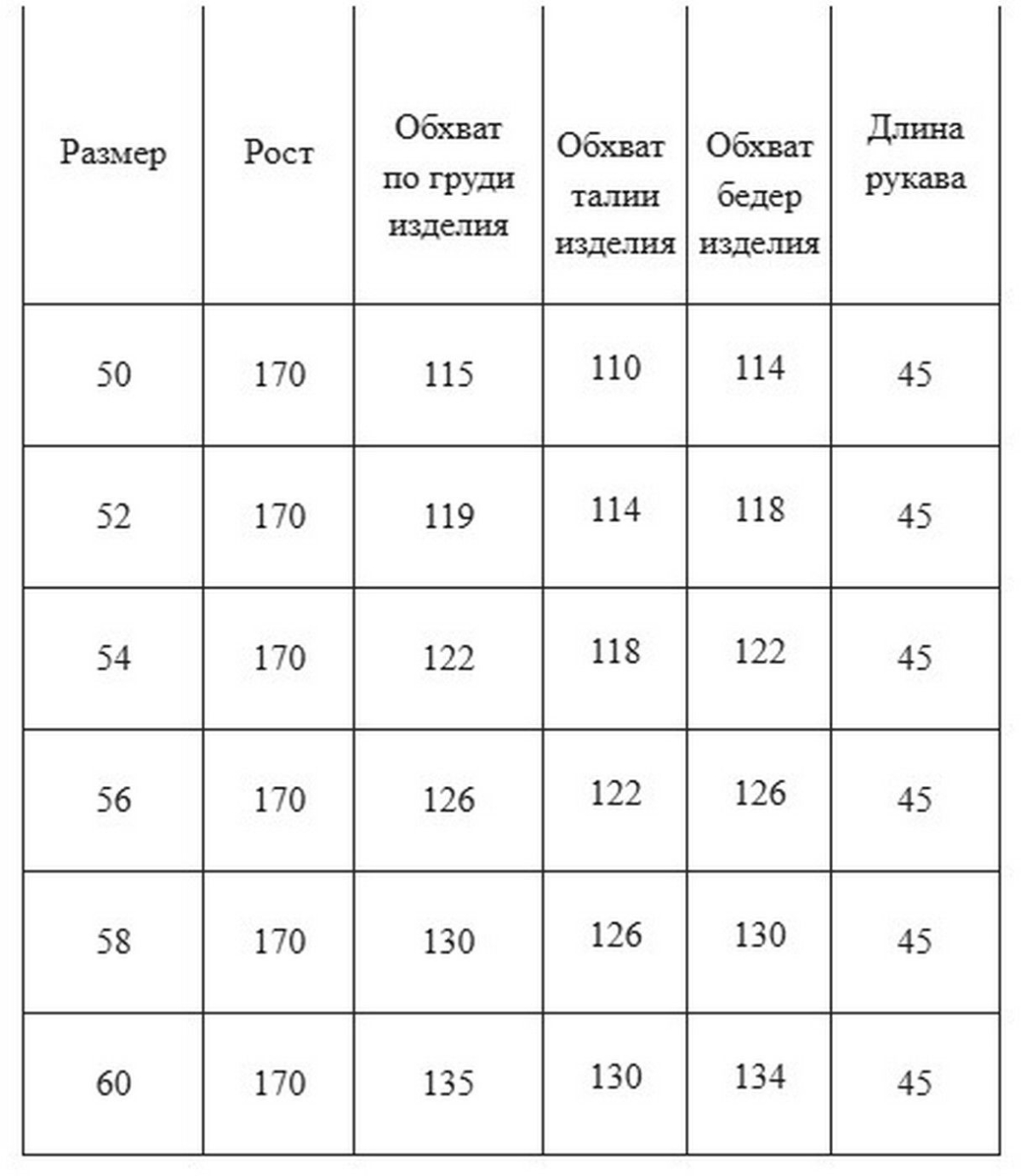 Размеры: 48, 50, 52, 54, 56, 58, 60, 62