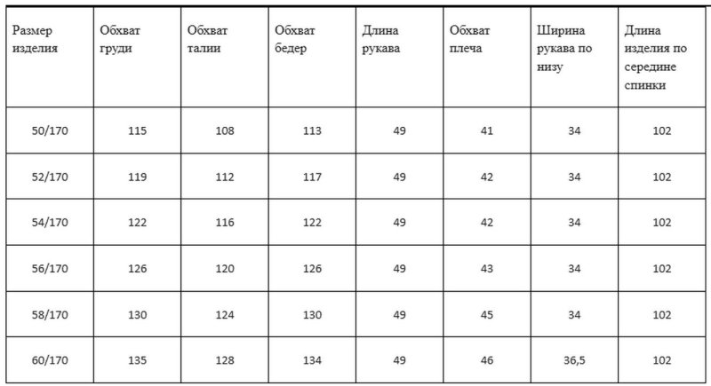 Размеры: 48, 50, 52, 54, 56, 58, 60, 62