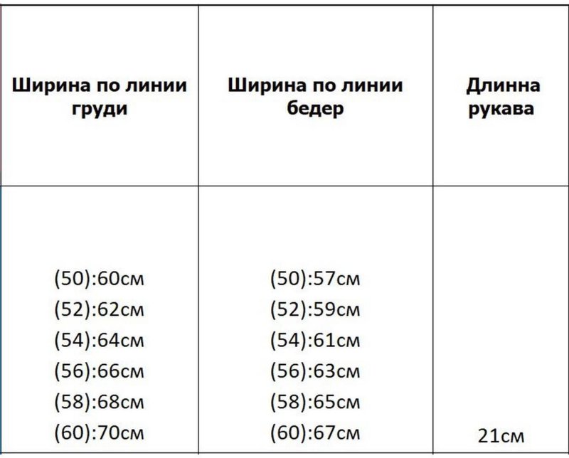 | Размер | Обхват груди (см) Грудь | Обхват талии (см) Талия | Обхват бедер (см) Бедра |