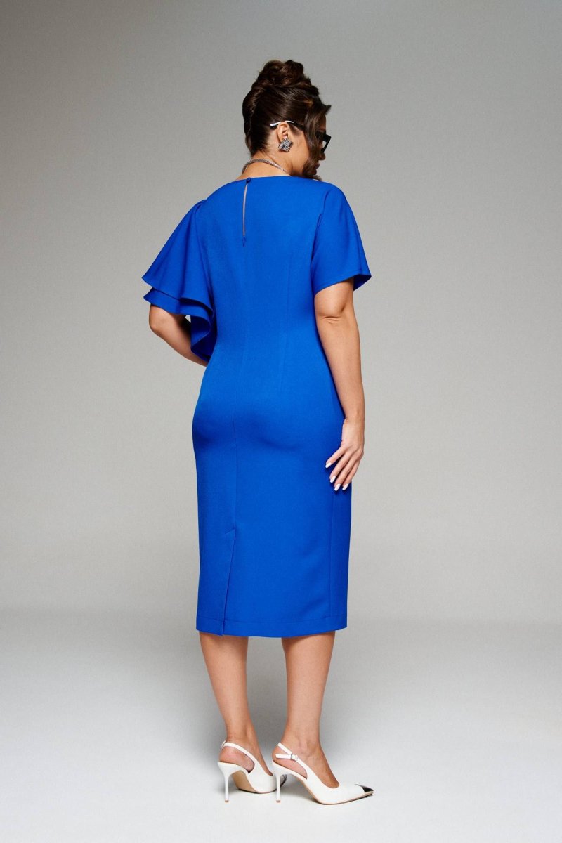Воплощение мечты о весне после зимы. Создавать романтические образы можно всегда - носим платье в любой сезон. Платье женское, прилегающего силуэта в нарядно-романтическом стиле; выполнено из костюмно-смесового полотна приятного на ощупь. Перед платья с наклонным подрезом чуть выше уровня талии и с вертикальными вытачками от него. Спинка разрезная по среднему шву, в верхней части которого предусмотрена потайная молния, с небольшим разрезом-каплей, который фиксируется на петлю и пуговицу, а в нижней – шлица. Так же на спинке присутствуют две вертикальные вытачки на уровне талии. Горловина овальной формы. Рукава асимметричные. Правый рукав цельнокроеный, со спущенной линией плеча. Левый рукав-крылышко – свободный и широкий.