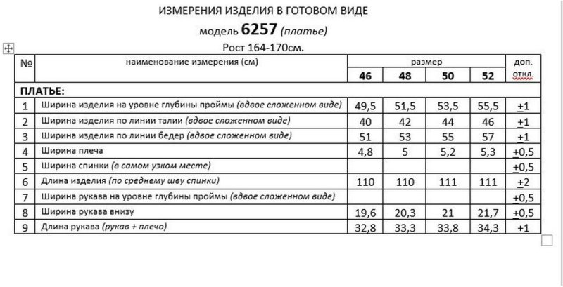 Таблица размеров