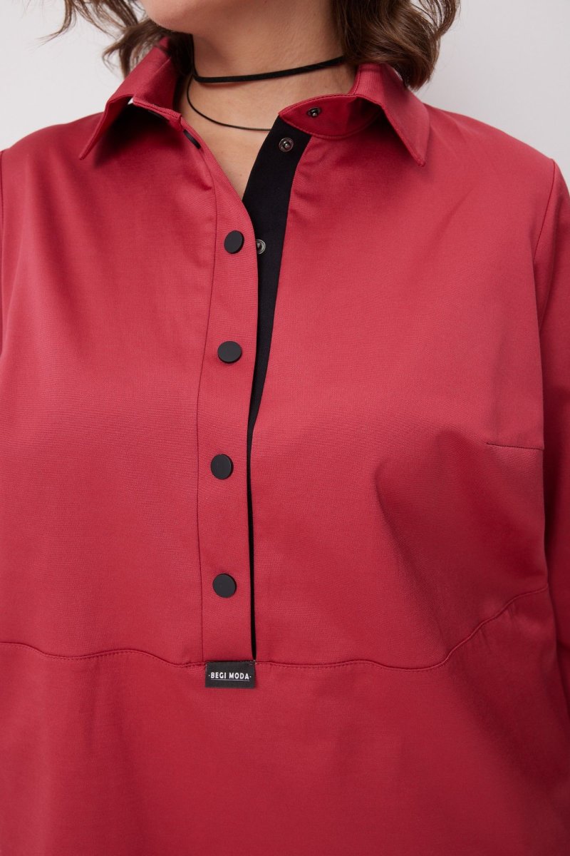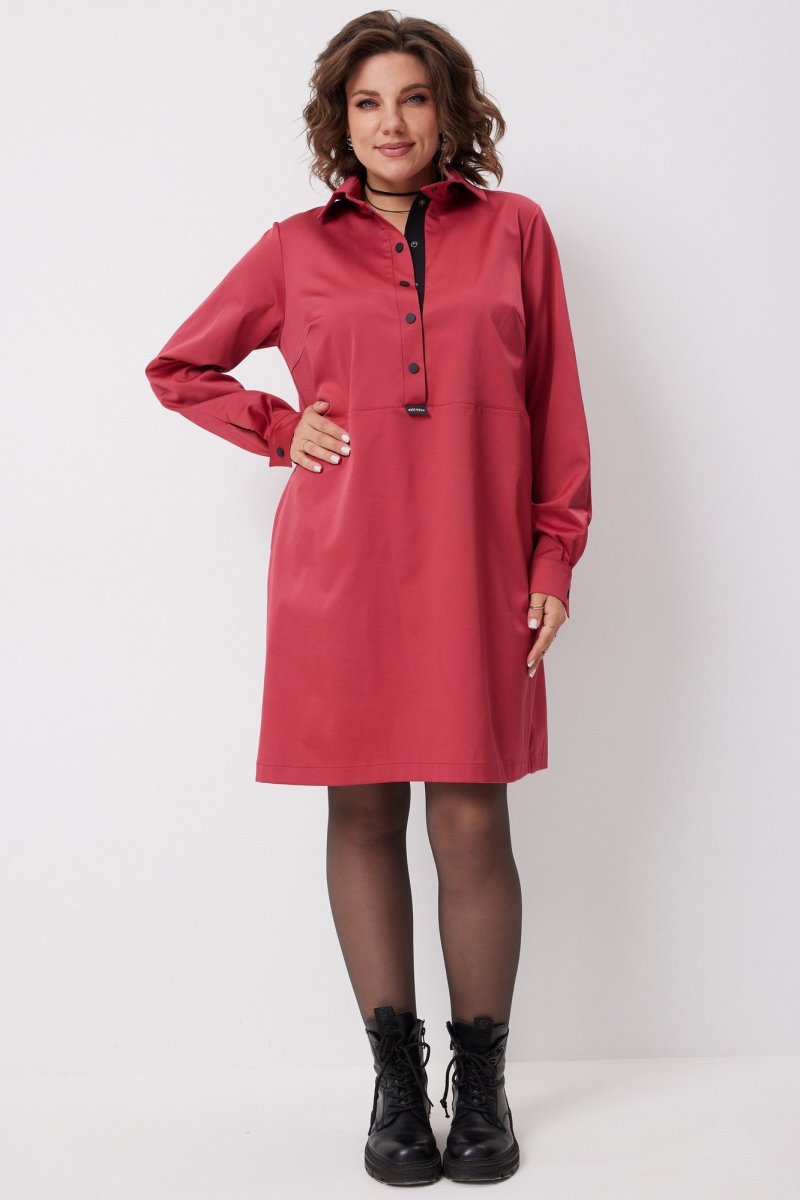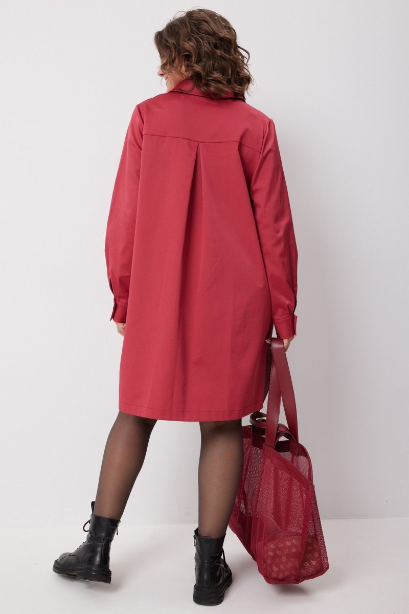 Платье свободного силуэта с отложным воротником со стойкой. Передняя часть платья на притачной планке с застёжкой на кнопки, с нагрудными вытачками. Рукав втачной с манжетой, застёгивающейся на кнопку. Спинка на кокетке со встречной складкой. Низ изделия обработан в подгибку. Изюминкой модели является контрастная отделка планки и рукавов, а также нашивка с логотипом бренда на передней части платья.