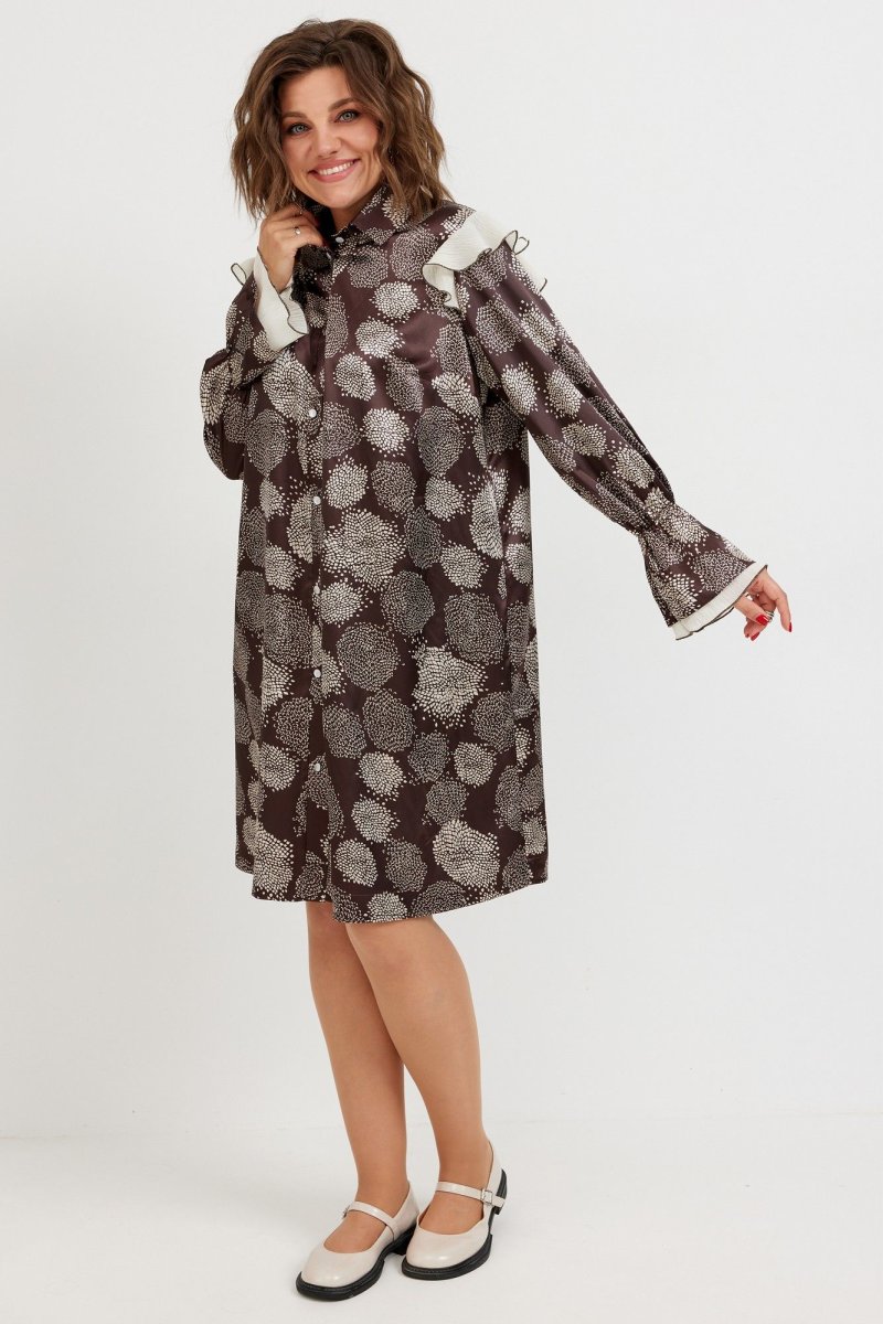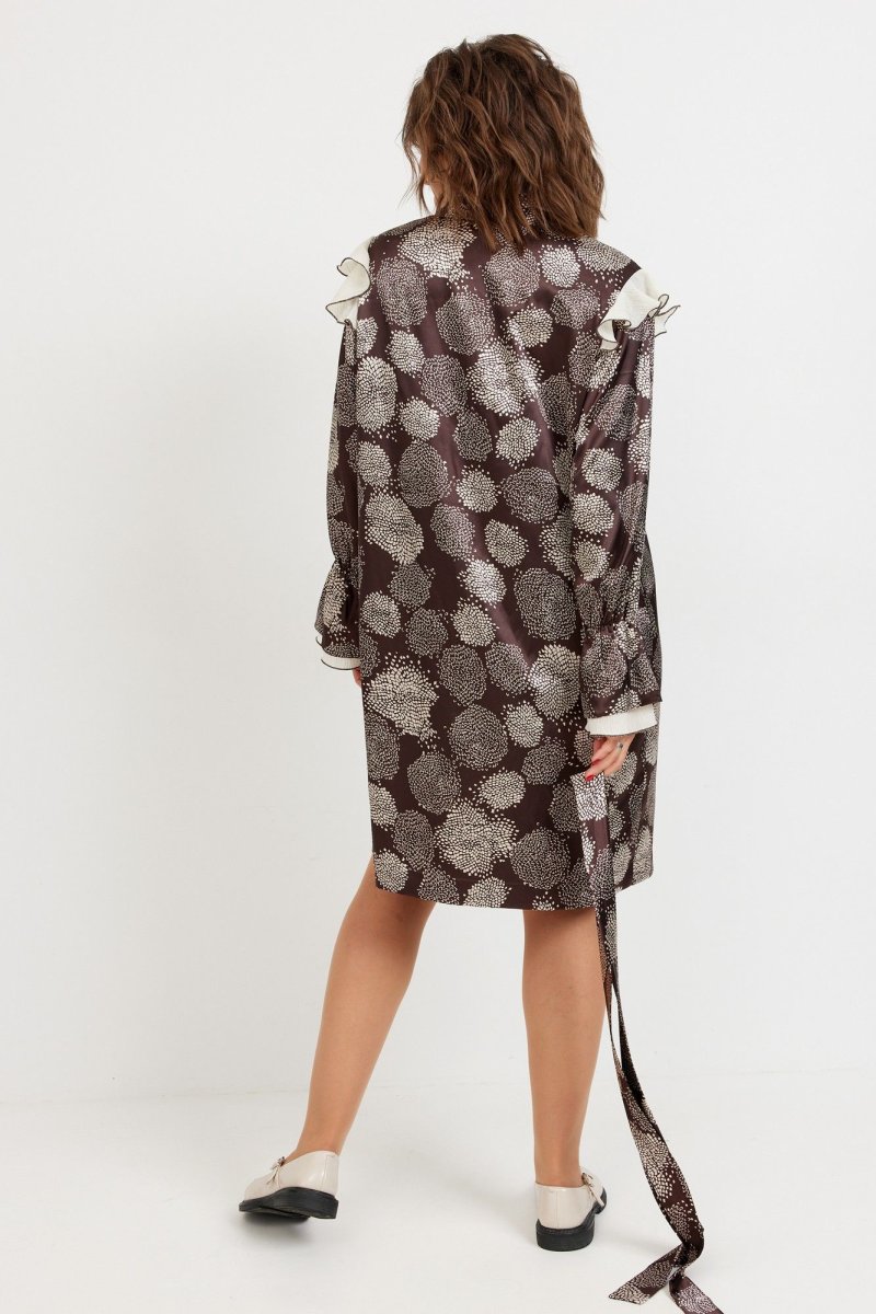 Шикарное платье в дорогом трендовом шоколадном оттенке с переливом на ткани, непременно придётся по вкусу элегантным модницам! Модель прекрасно впишется в гардероб, позволяя его обладательнице блистать на праздниках и вызывать восторг окружающих в будни. Особый шарм и женственность платью придаёт отделка воланами из нежнейшего шифона с фактурой жатки.