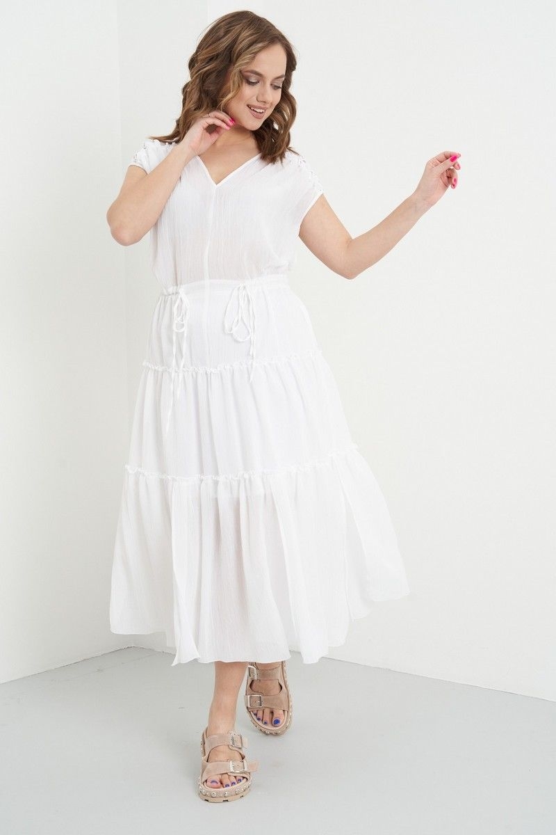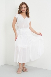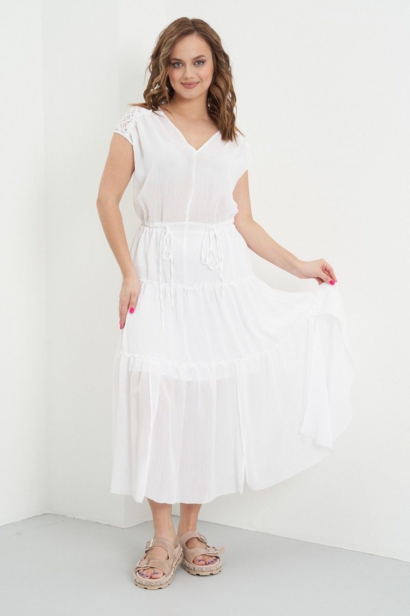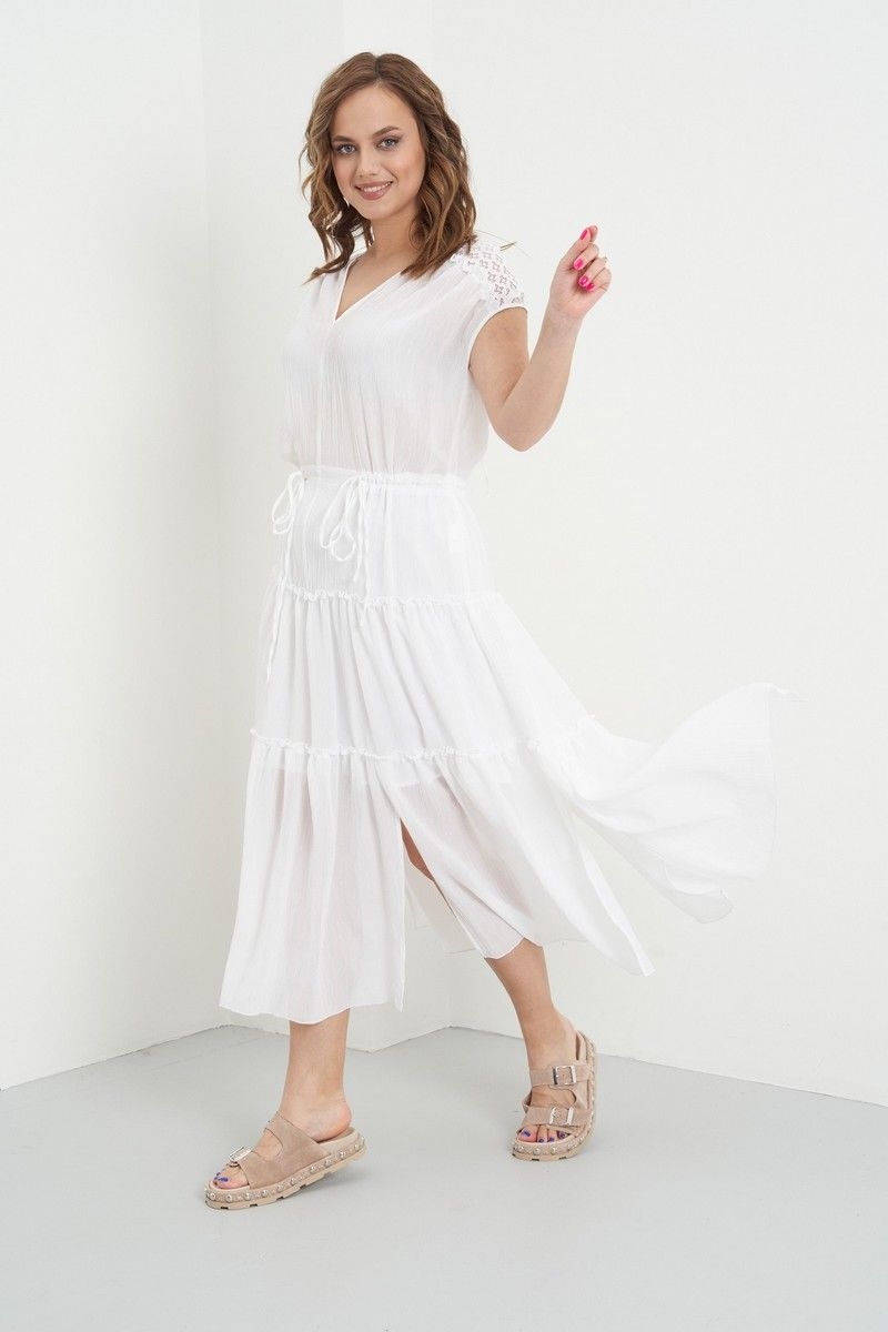 Нет предмета женской одежды более женственного и более универсального чем платье. Немного смелости: попробуйте, примерьте и, непременно, вы оцените новое белое платье-сарафан, ведь это супертренд лета. Белая одежда отражает наше стремление к простоте, заставляет нас мечтать о безмятежном отдыхе, а благодаря несложным стилевым решениям это ещё и супермодно. Лёгкая дышащая ткань с эффектом жатости, х/б подкладка, оригинальные кружевные вставки на плечах, V-образный вырез, регулируемая кулиса и эффектные разрезы-шлицы по нижнему волану. Длина платья 85 см от линии талии.