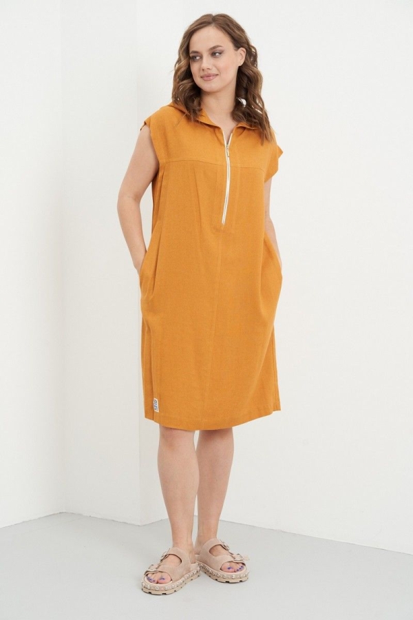 Женское платье из льняной однотонной ткани для повседневной носки. Платье прямого силуэта, со спущенной линией плеча, и проймой, переходящей в подрез треугольной формы. Перед лифа состоит из двух частей: горизонтальной кокетки с цельнокроенным капюшоном и нижней части. Застёжка на тесьму-молнию в центральном шве переда. Спинка платья состоит из двух частей: горизонтальной кокетки и нижней части, в среднем шве спинки обработана шлица. В боковых швах - карманы.Длина платья по среднему шву спинки около 99 см.