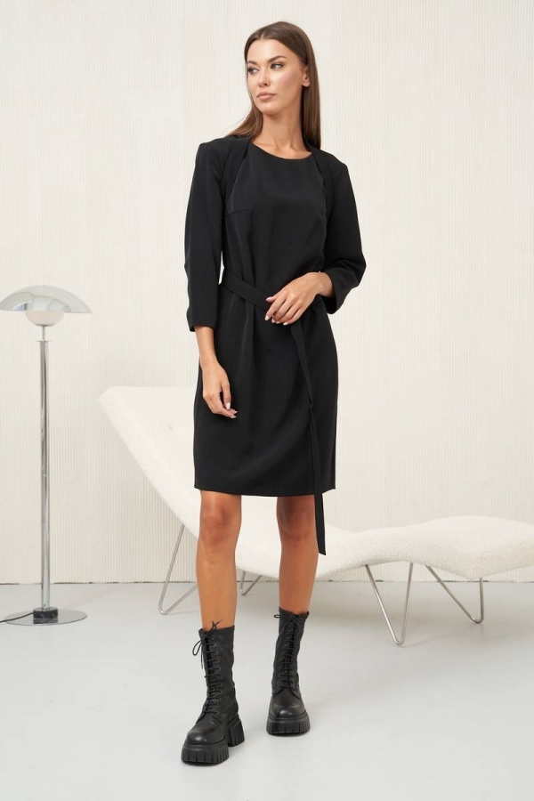 Даже если женщина предпочитает спортивный стиль, в её гардеробе обязательно найдётся хотя бы одно платье. И хорошо, когда это платье универсальное, удобное, носить которое можно в разных вариантах, подходящее для разных мероприятий, меняющее образ своей обладательницы в зависимости от настроения. Предлагаем вам обратить внимание на такое платье силуэта shift в базовом цвете. Платье с втачными рукавами длиной 3/4 с локтевой вытачкой. Вырез горловины овальной формы. По переду - нагрудные вытачки. Спинка с центральным швом и плечевыми вытачками, идущими из линии горловины. По центру горловины спинки - отделочная пата, через которую продевается съёмный декоративный пояс, застёгивающийся спереди на серебристую пряжку. Длина платья по спинке около 92 см. Длина рукава около 48 см.