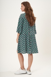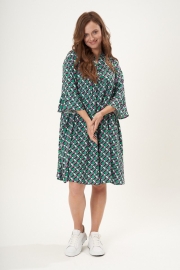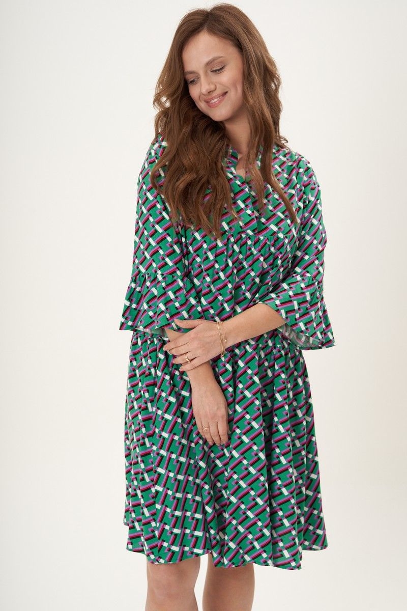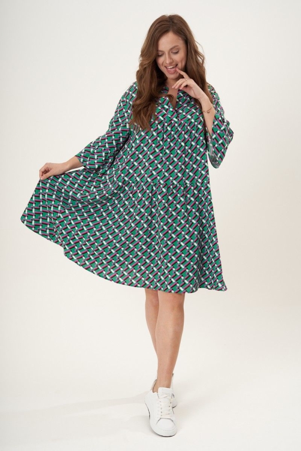 Платье свободной конической формы, рубашечного силуэта в актуальной миди-длине. Рукава длиной 3/4 на спущенной линии проймы с воланом по низу.