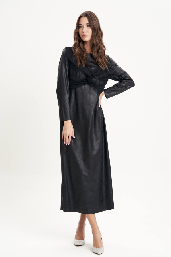 Вечно актуальное и самое эффектное! Это, конечно же, о длинном чёрном платье! Казалось бы, придумать что-то новое уже невозможно, но мы опять удивляем вас необычным сочетанием модных фактур и покроя при, казалось бы, минималистичном платье. Полуприлегающий силуэт, втачной покрой, эффектное трикотажное полотно с покрытием под кожу и потрясающе изысканный элемент из сборенной сетки по полочке и спинке. Полочка с нагрудной вытачкой, спинка с центральным швом, застёжкой на потайную молнию и разрезом. Длина платья около 132 см, длина рукава около 60 см.