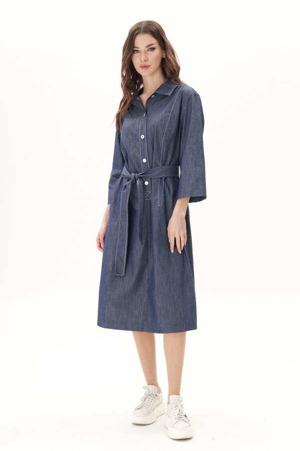 Платье, в котором можно выглядеть повседневно и празднично, игриво и элегантно, в зависимости от настроения, создавать совершенно разные, яркие, запоминающиеся образы. Платье полуприлегающего силуэта, втачного покроя, с рубашечным воротником на цельнокроеной стойке. Полочка с вертикальными рельефами и частичной застежкой на петли и пуговицы. По боковым швам - карман с листочкой. Спинка с отрезной кокеткой, срезным швом и вертикальным частичным рельефом. Модель дополнена съемным поясом. Все конструктивные элементы подчёркнуты отделочными контрастными строчками. Длина платья 107 см длина рукава 48 см
