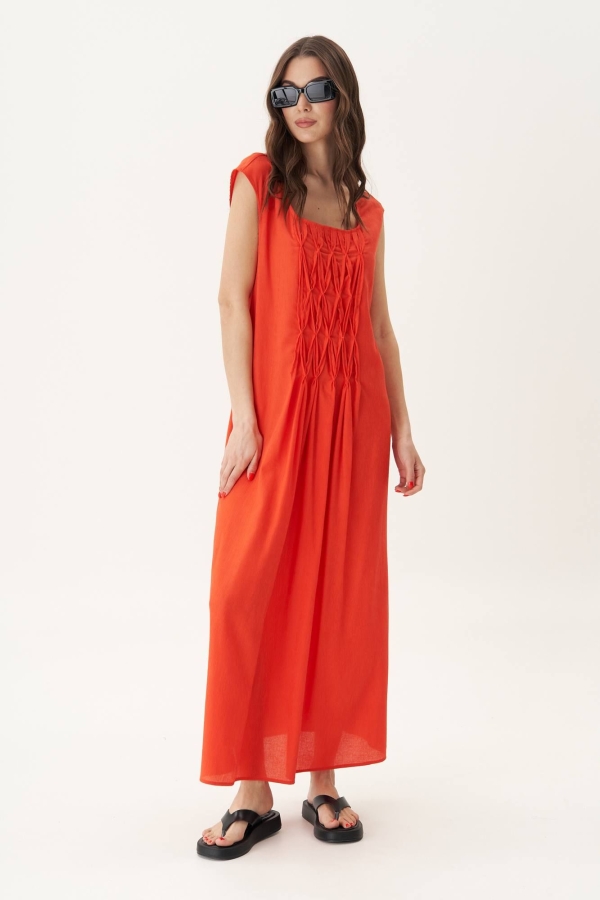 Красивое, воздушное платье… Это то, что находится в нашем гардеробе не только для настроения, но и для самоощущения. Масштабируя женственность, оно дарит уверенность в себе, лёгкую походку, грацию… Свободный А-силуэт, покрой с заниженной линией плеча, длина макси. Полочка с эффектным вырезом и авторскими сложными буфами. Спинка - со средним швом. Длина платья около 130 см.