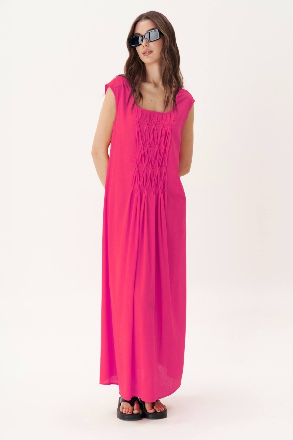 Красивое, воздушное платье… Это то, что находится в нашем гардеробе не только для настроения, но и для самоощущения. Масштабируя женственность, оно дарит уверенность в себе, лёгкую походку, грацию… Свободный А-силуэт, покрой с заниженной линией плеча, длина макси. Полочка с эффектным вырезом и авторскими сложными буфами. Спинка - со средним швом. Длина платья около 130 см.