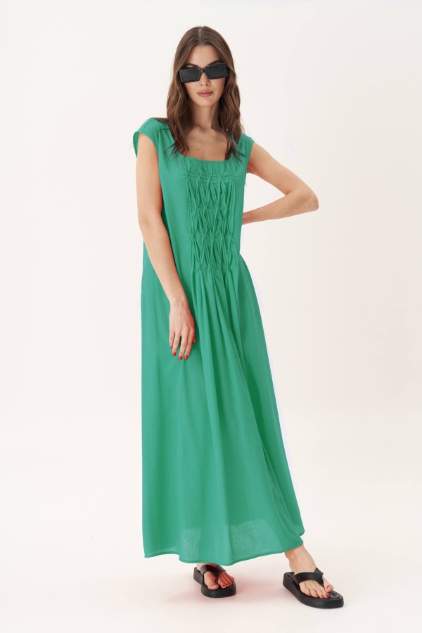 Красивое, воздушное платье… Это то, что находится в нашем гардеробе не только для настроения, но и для самоощущения. Масштабируя женственность, оно дарит уверенность в себе, лёгкую походку, грацию… Свободный А-силуэт, покрой с заниженной линией плеча, длина макси. Полочка с эффектным вырезом и авторскими сложными буфами. Спинка - со средним швом. Длина платья около 130 см.