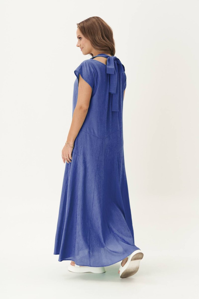 Свободный А-силуэт с цельнокроенным рукавом, ассиметричные линии членения отрезной нижней части платья с коническими вставками и эффектным разрезом. Оригинальный вырез горловины с завязкой-бантом на спинке.
