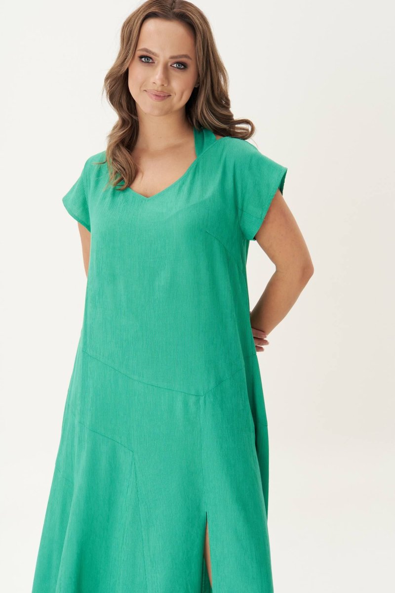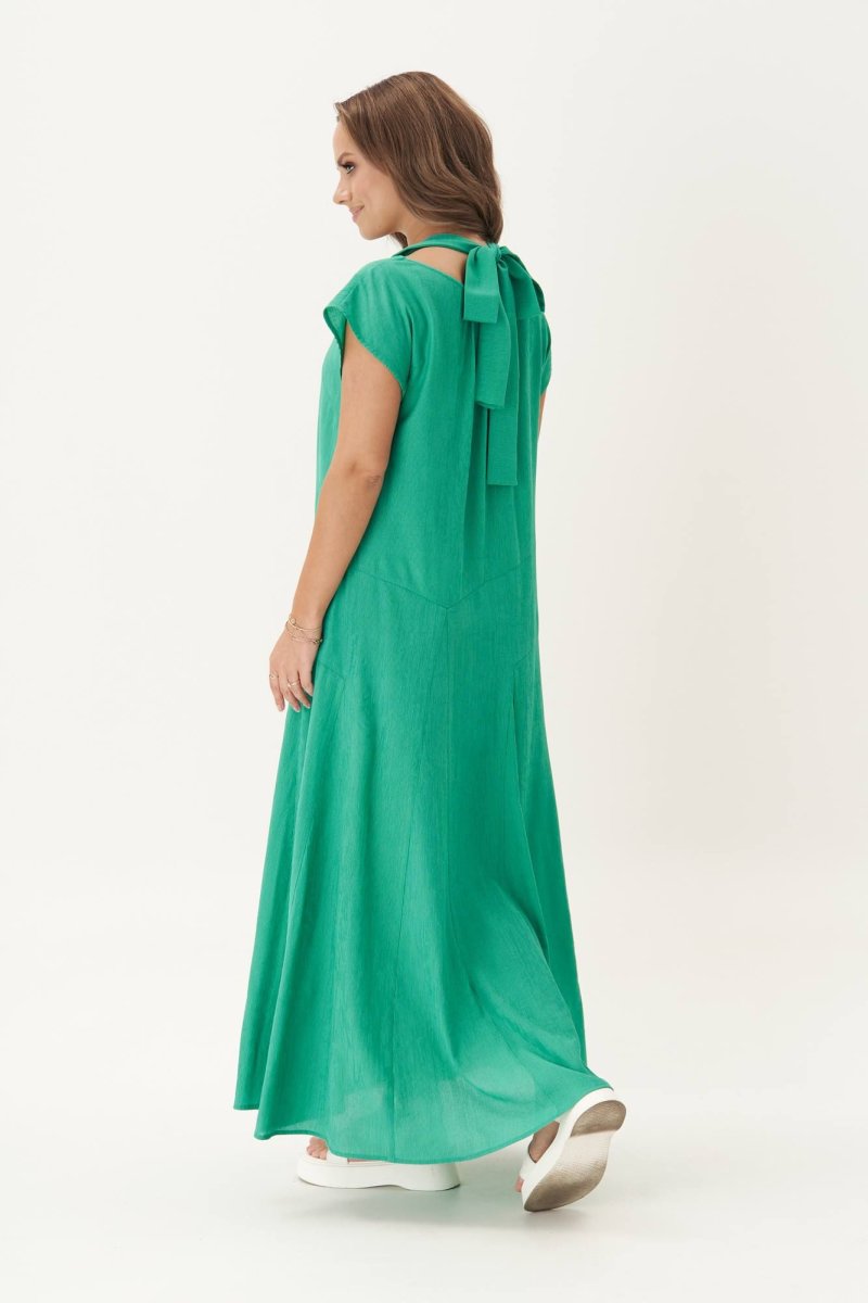 Свободный А-силуэт с цельнокроенным рукавом, ассиметричные линии членения отрезной нижней части платья с коническими вставками и эффектным разрезом. Оригинальный вырез горловины с завязкой-бантом на спинке.
