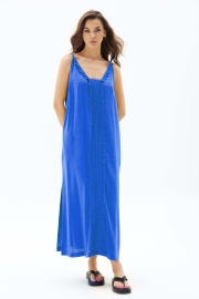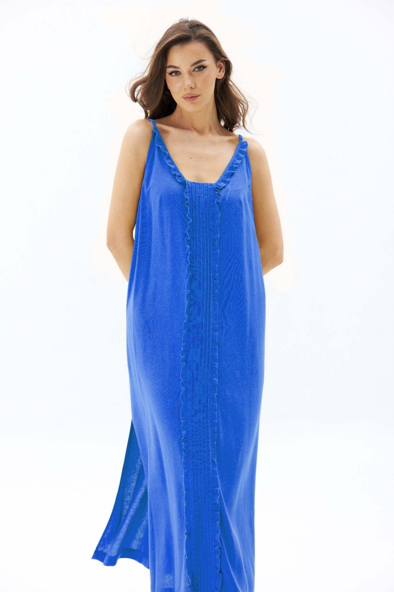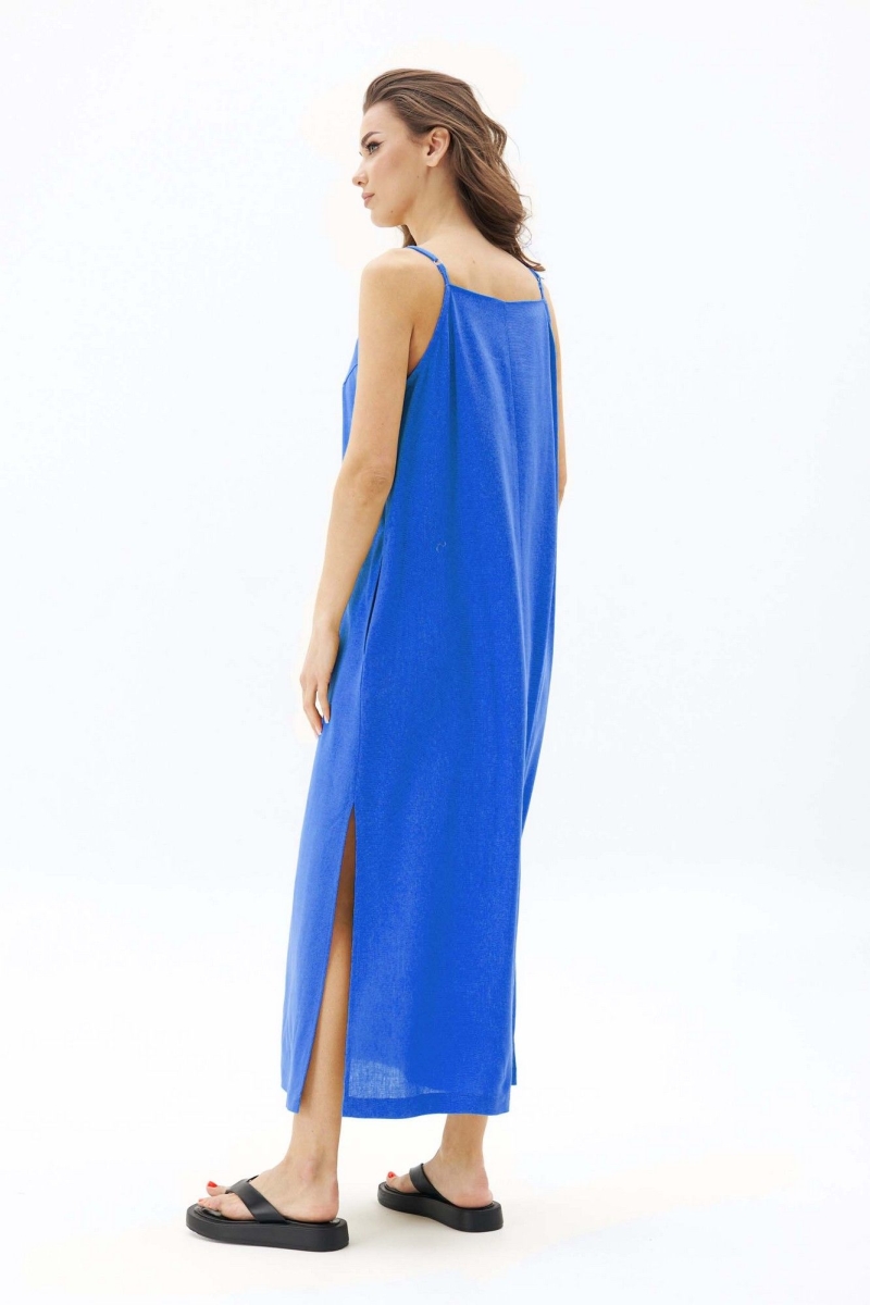 Самый классический и самый любимый вариант летнего сарафана - сарафан прямого кроя. Он не теряет своей популярности, ведь с ним очень легко создавать модные образы. Лаконичность и изысканность - вот главная идея нашего сарафана. Полочка со сложным вырезом, нагрудной вытачкой, отрезной центральной частью с защипами и кокетливой рюшей. Спинка со средним швом. По боковым швам карманы и эффектные разрезы. Бретель тонкая, регулирующаяся. Длина сарафана около 132 см.