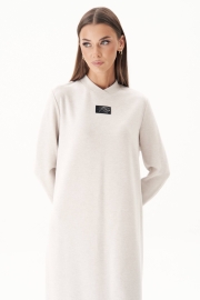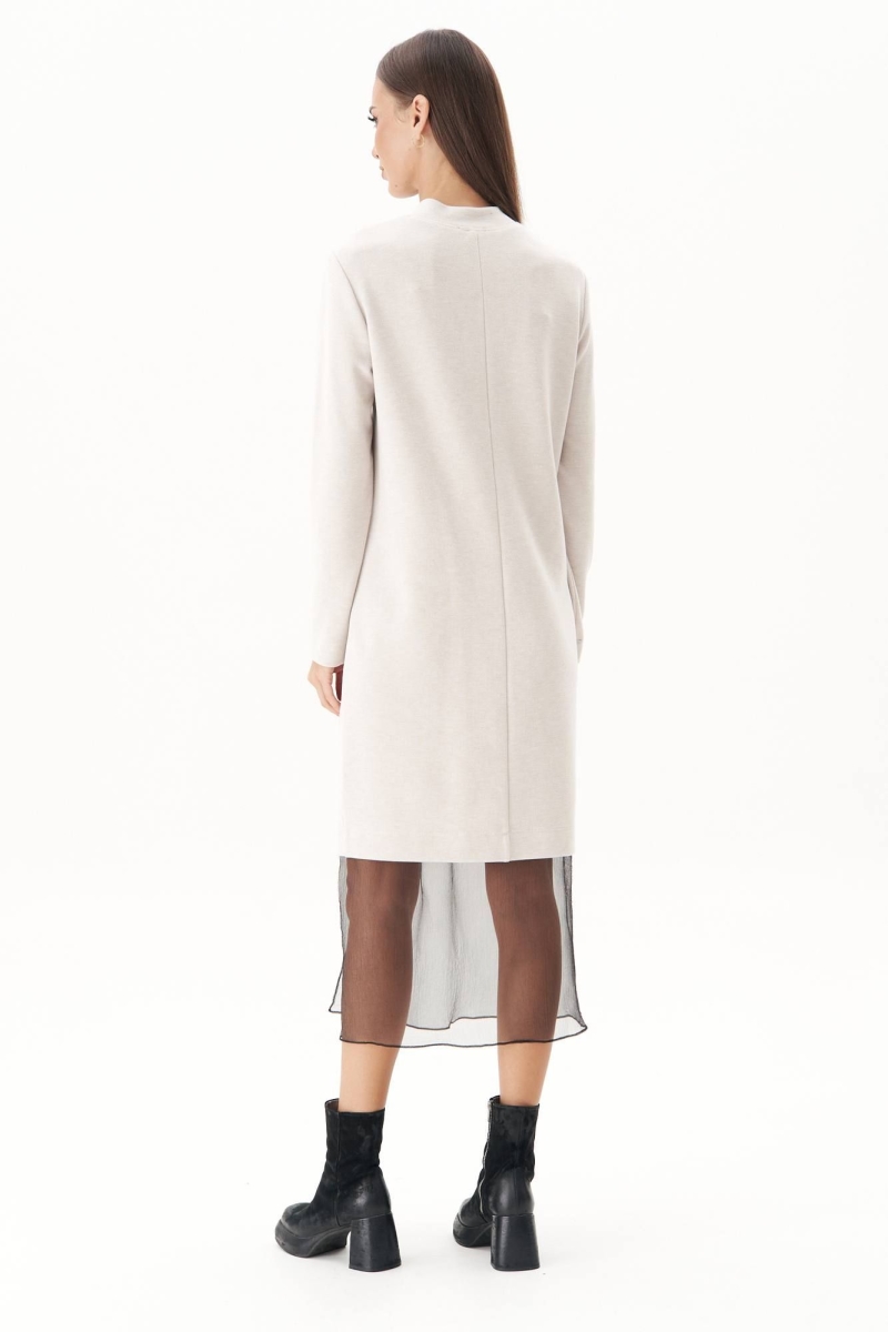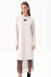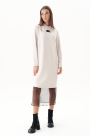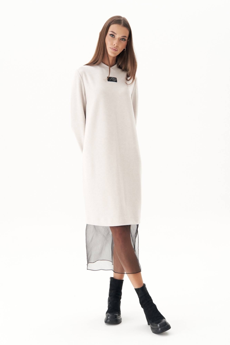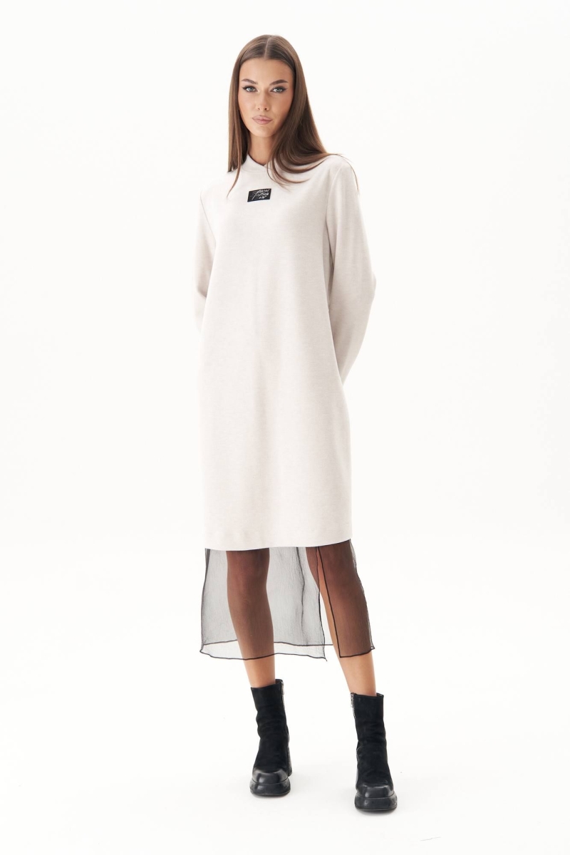 Забудьте о том, что трикотажное платье - это скучный аутфит. Декорированное отдельными акцентными элементами, оно становится дерзким и соблазнительным. Силуэт свободный, слегка упрямленный, покрой втачной, воротник-стойка. По центру переда - нашивка, по низу платья - акцентная деталь из контрастной органзы. Длина платья около 125 см. Длина рукава около 62 см.