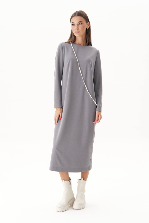 Это платье - настоящий мастхэв на долгий зимний сезон. Комфортное вискозное полотно, минималистический крой, эффектная спинка и длинный рукав. Оно легко вписывается в городской лук и уместно смотрится в деловом стиле. Свободный упрямленный силуэт, втачной покрой, круглая горловина. Полочка с нагрудной вытачкой. спинка с центральной застежкой на петли и пуговицы и плечевой вытачкой. Рукав двухшовный. Длина платья около 110 см. Длина рукава около 60 см. Украшение в комплект не входит.