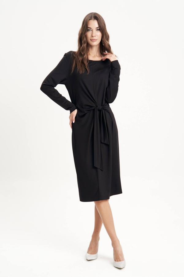 Драпировка - это ключевой элемент платья сезона 2025 г. Этот приём позволяет создать мягкий, женственный силуэт, при этом придаёт образу динамику. Расположенная в области талии она эффектно подчёркивает фигуру. Платье полуприлегающего силуэта, втачного покроя с круглым вырезом горловины и длинным рукавом. Комфортное вискозное полотно, средняя длина. Полочка с центральным швом и ассиметричным поясом-завязкой, образующим драпировку на правой половине. Рукав одношовный. Длина платья около 107 см. Длина рукава около 62 см.