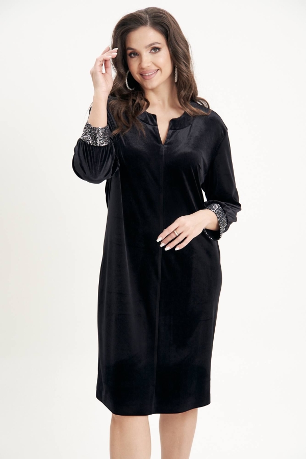 Платье остаётся неизменным символом женственности и элегантности, являясь ключевым элементом гардероба. Акцент - на многофункциональность! Это и самостоятельный наряд, и в дополнении с другими элементами одежды (жакеты) - гармоничный образ от вечернего выхода до повседневного. Свободный упрямлённый силуэт, втачной рукав, круглая горловина с акцентным треугольным вырезом. Спинка с центральным швом. Рукав 3/4 с акцентной деталью из пайеток.