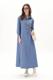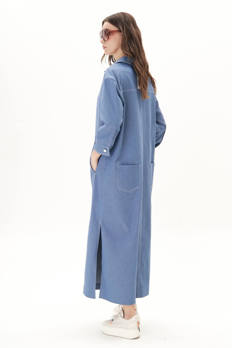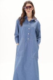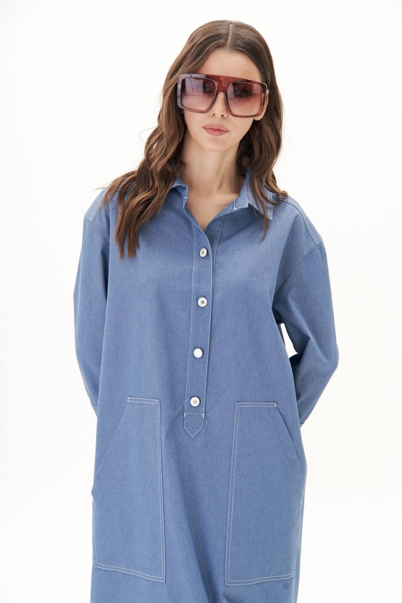 Платье свободного А-силуэта, рубашечного покроя с заниженной линией плеча, рубашечным воротником и рукавом. Полочка с частичной застежкой и накладными фигурными карманами. Спинка с отрезной кокеткой, средним швом и накладными задними карманами. Рукав с локтевой планкой и притачной манжетой с петлей и пуговицей. По боковым швам - разрезы. Все конструктивные элементы платья подчёркнуты контрастными отделочными строчками. Длина платья 132 см. Длина рукава с плечом 60 см.