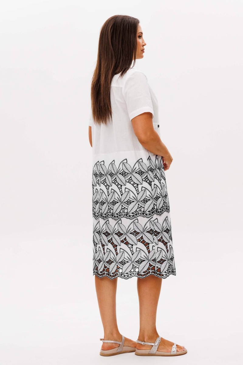 Платье из батиста, очень тонкое и практически не ощутимо ношении, в приоритете простота и удобство. Такой вариант всегда в моде. Белое платье с контрастной вышивкой и интересным кроем. Прямой силуэт, втачной покрой, центральная застежка на петли и пуговицы, воротник-стойка. Полочка и спинка двойные от линии талии до 3/4 бедра. Полочка с отрезной кокеткой со сборкой и накладными карманами. Спинка с отрезной кокеткой и сборкой. Модель дополнена Контрастными пуговицами. Длина платья около 107 см. Длина рукава около 22 см.