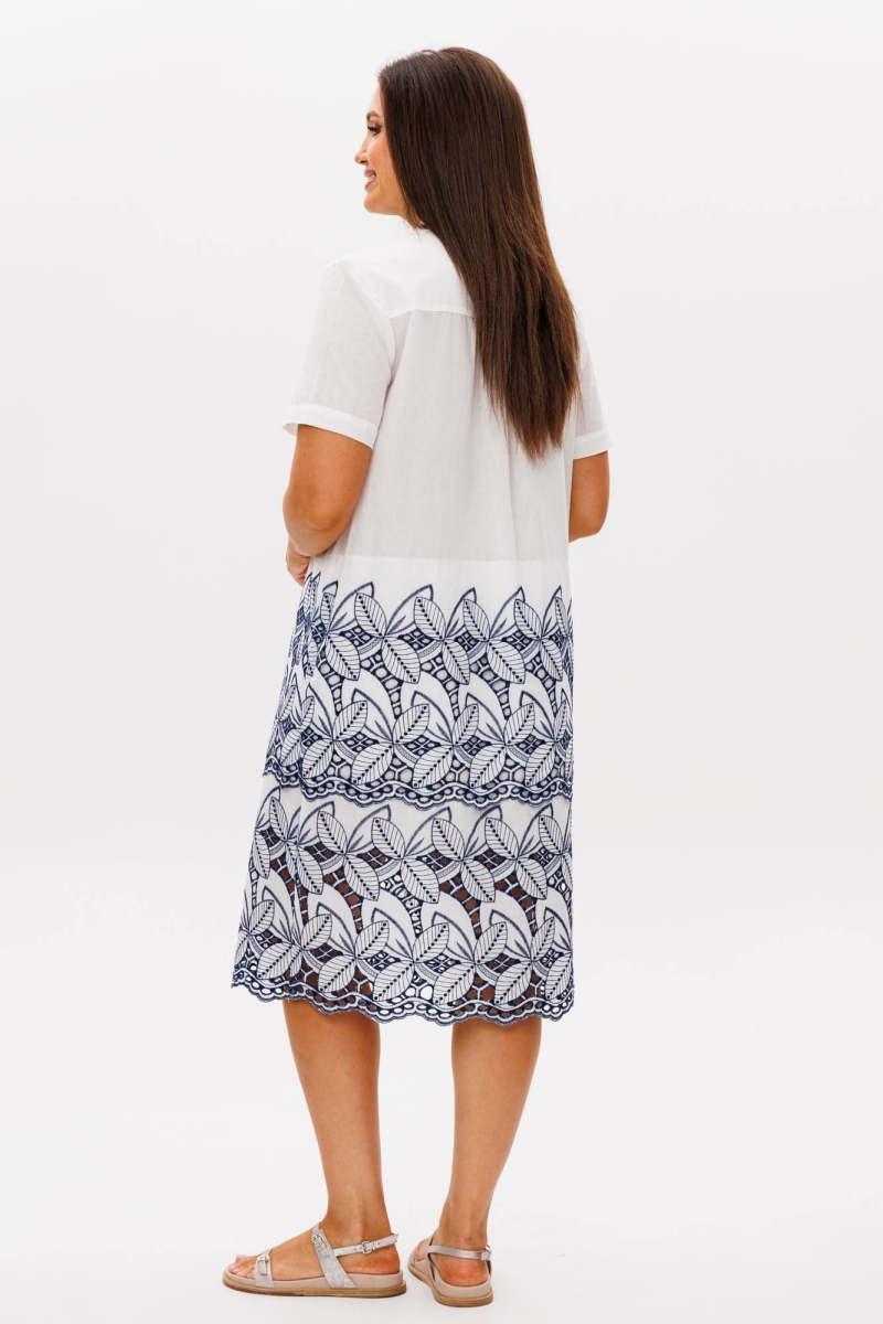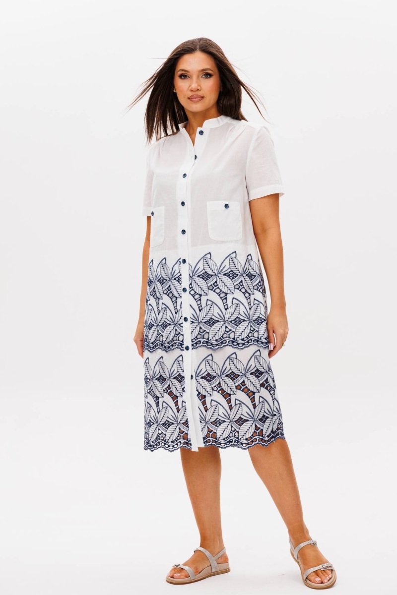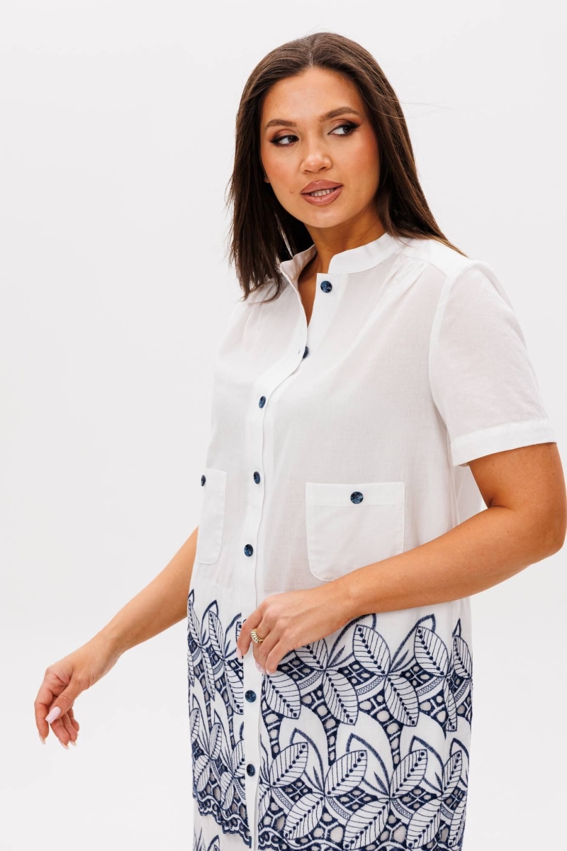 Платье из батиста, очень тонкое и практически не ощутимо ношении, в приоритете простота и удобство. Такой вариант всегда в моде. Белое платье с контрастной вышивкой и интересным кроем. Прямой силуэт, втачной покрой, центральная застежка на петли и пуговицы, воротник-стойка. Полочка и спинка двойные от линии талии до 3/4 бедра. Полочка с отрезной кокеткой со сборкой и накладными карманами. Спинка с отрезной кокеткой и сборкой. Модель дополнена Контрастными пуговицами. Длина платья около 107 см. Длина рукава около 22 см.