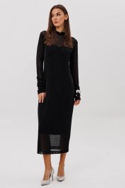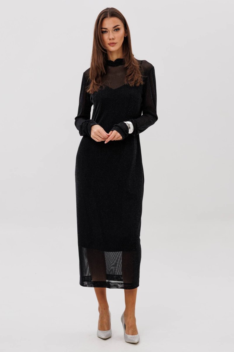 Женственное платье втачного покроя выполнено из мерцающей сетки, красиво играющей при движении. Драпированные рукава и стоячий воротник добавляют утончённости, а подкладка-чехол обеспечивает комфорт и идеальную посадку. Образ одновременно выдержанный, современный и эффектный.