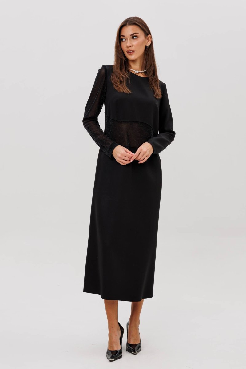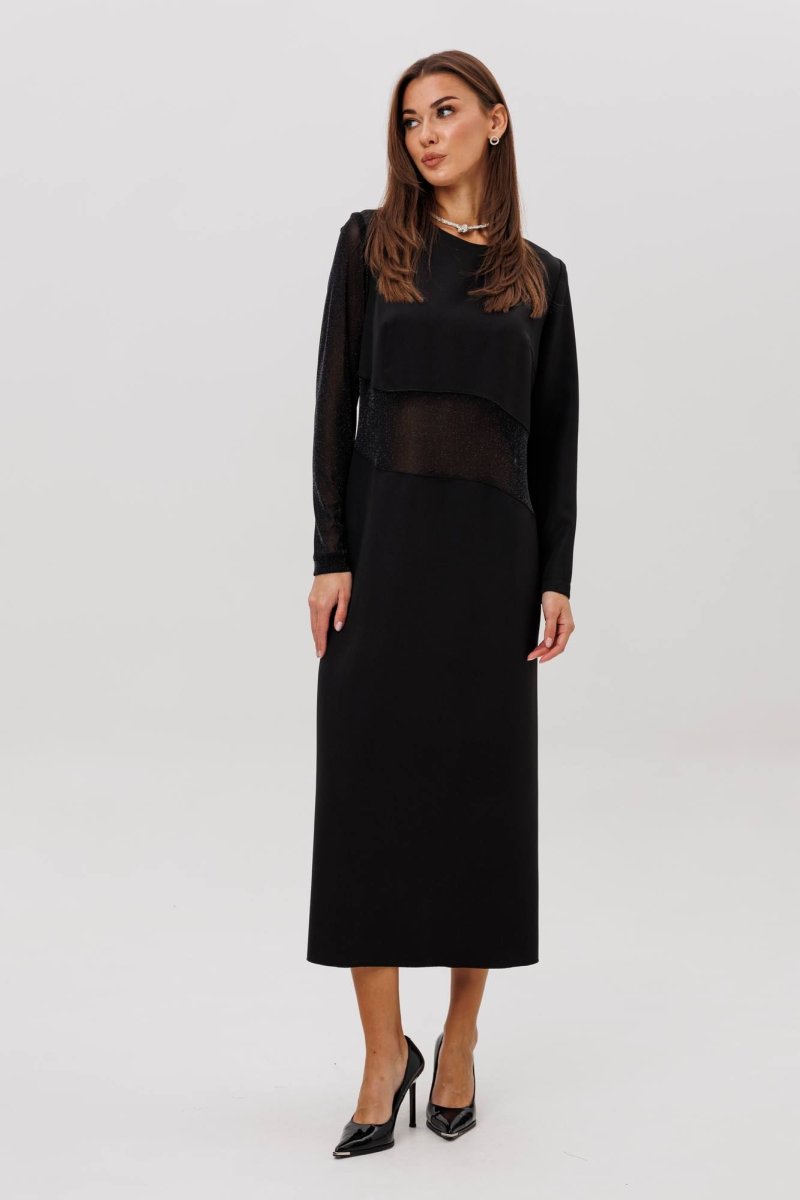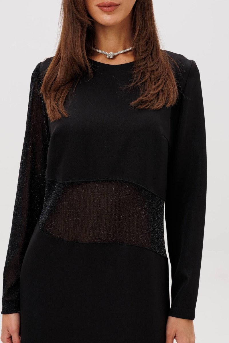 Главный акцент модели — сочетание разных фактур: полупрозрачный рукав и асимметричная вставка из мерцающей сетки создают лёгкий «вуальный» эффект, добавляя образу загадочности и современного шика.