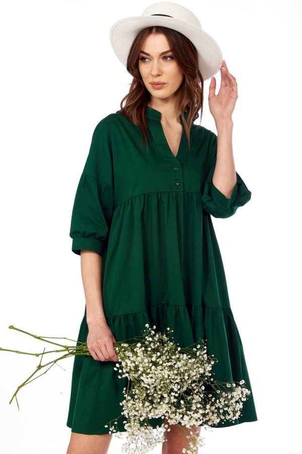 Платье женское, свободного силуэта, с застежкой на две пуговицы в верхней части переда. Передняя и задняя часть платья с двумя отрезами и мелкой сборкой по всему изделию, в боковых швах карманы. В верхней части переда отделочная планка. Горловина со стойкой. Плечо спущенное, рукав с мелкой сборкой в верхней и нижней части с приталенной манжетой. Длина изделия по переду (44,46,48): 91см. Длина изделия по спинке (44,46,48): 95см. Длина рукава (44,46,48): 37см. Длина изделия по переду (50, 52, 54): 99см. Длина изделия по спинке (50, 52, 54): 102см. Длина рукава (50, 52, 54): 39см.