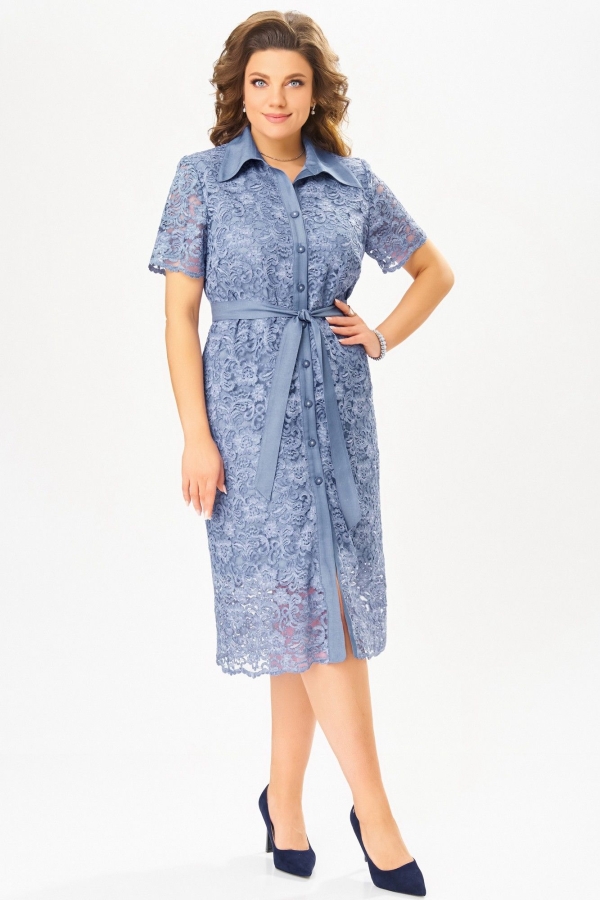 Нарядное платье "Ивка" выполнено из кружевной ткани с джинсовой отделкой. Платье прямого силуэта на подкладке со съемным поясом. Платье с застежкой на петли и пуговицы, планка отрезная, воротник отложной со стойкой рубашечного типа. По полочке - нагрудная выточка, рукав втачной одношовный, по низу изделия и рукавов декоративный край. Платье идеально для любого праздника и для повседневной носки.