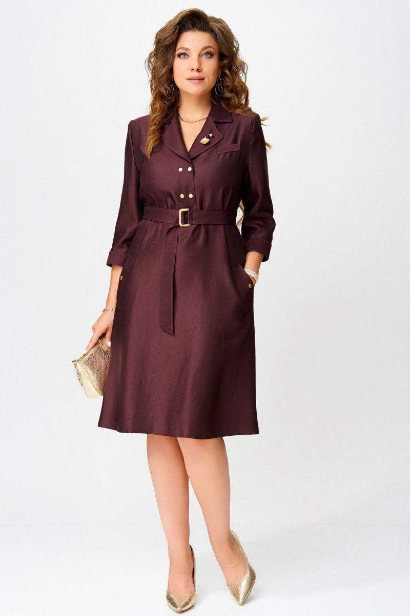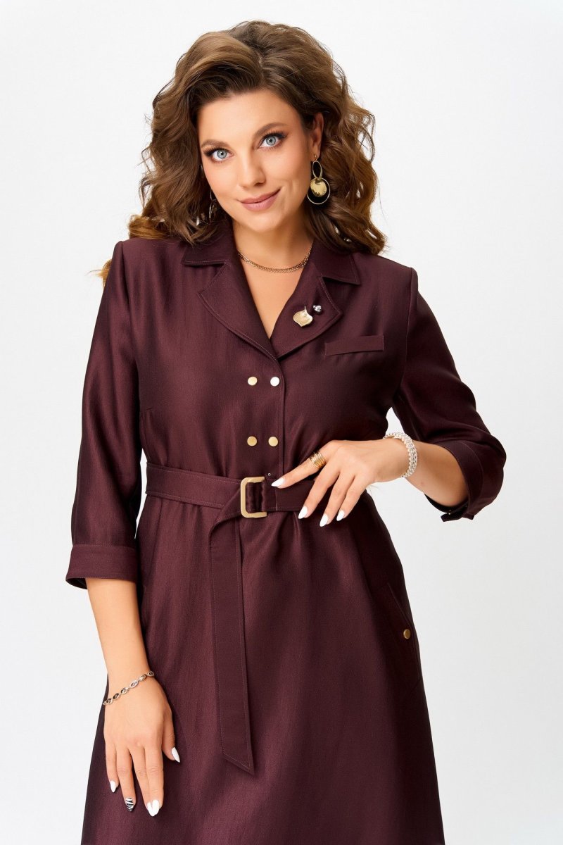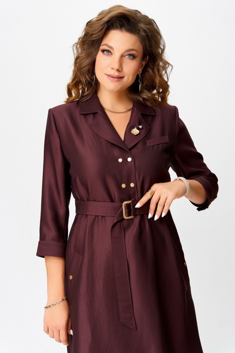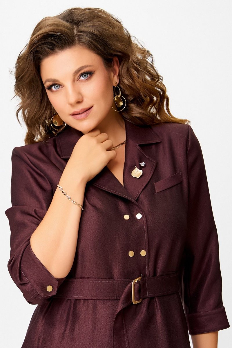 Двухшовные рукава с манжетами на кнопке — изысканная деталь, а открытый срез по низу платья — смелый дизайнерский жест. Завершающий акцент — декоративная брошь, как точка в изящной фразе.
