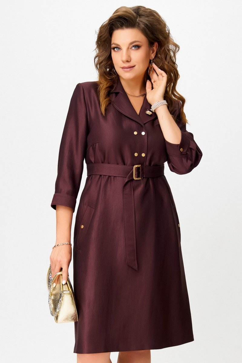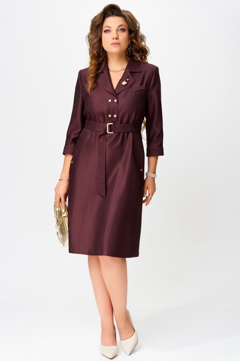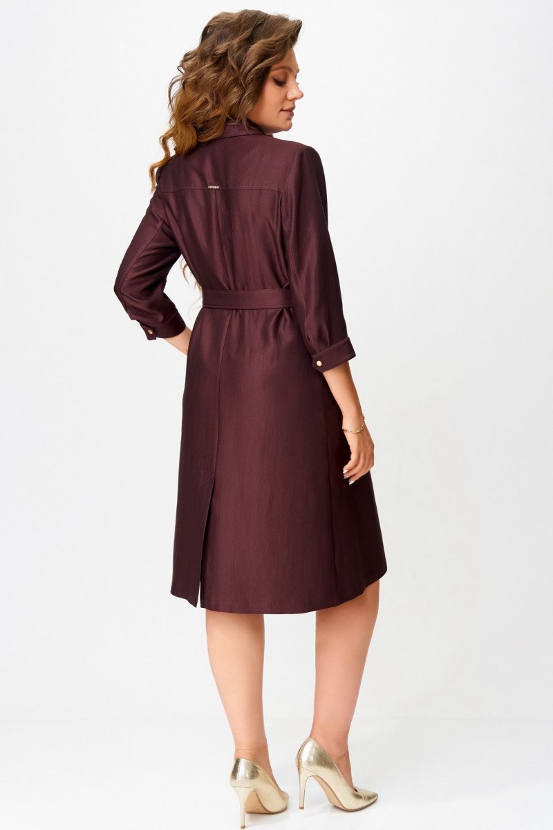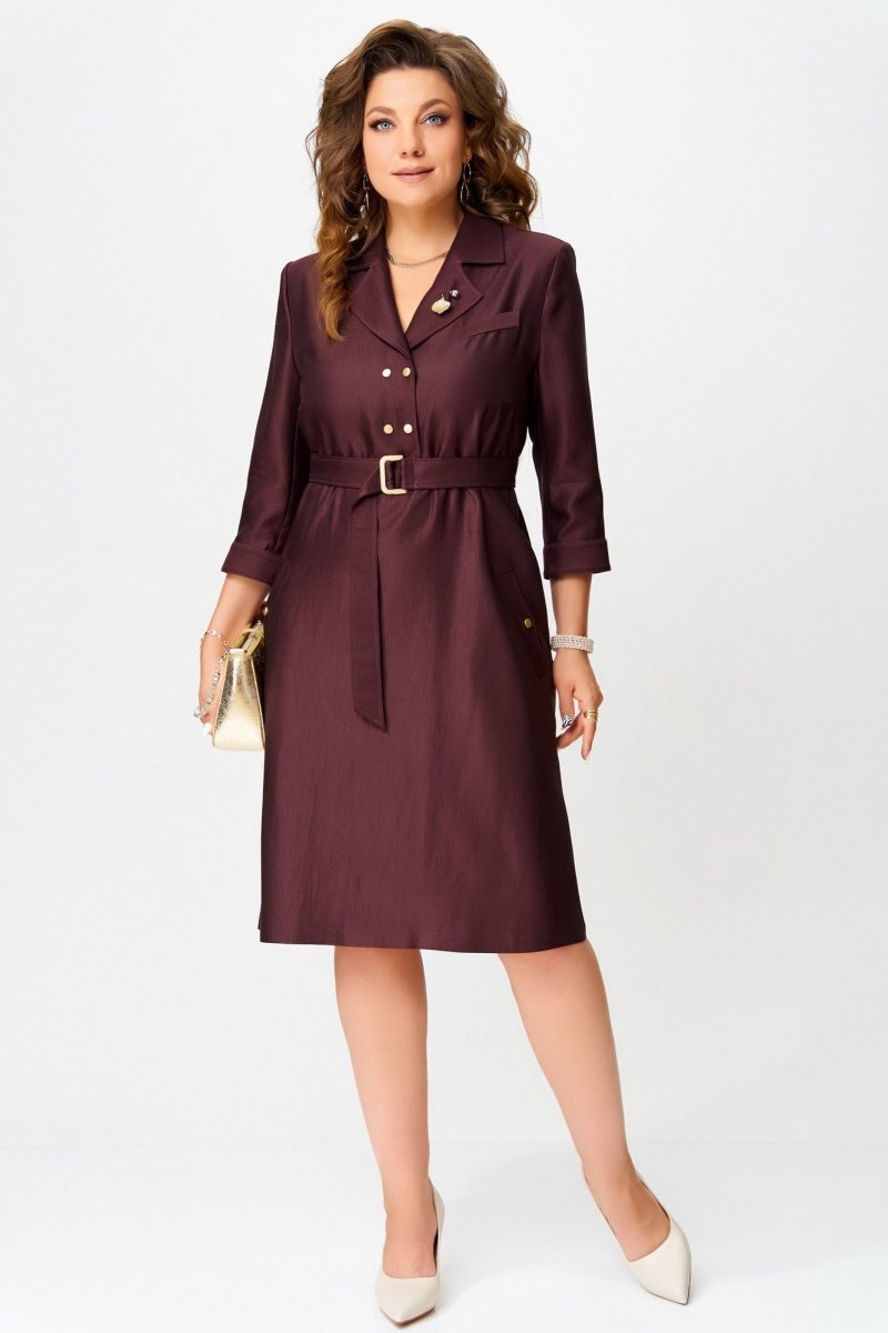 Двухшовные рукава с манжетами на кнопке — изысканная деталь, а открытый срез по низу платья — смелый дизайнерский жест. Завершающий акцент — декоративная брошь, как точка в изящной фразе.