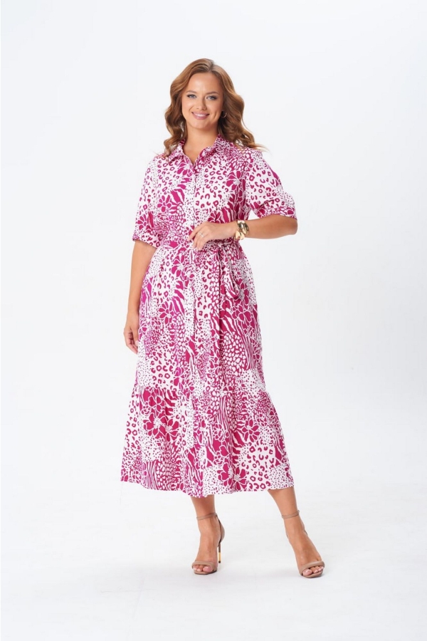 Платье А-образного силуэта выполнено из вискозной ткани с летним принтом. Платье с рубашечным воротником и центральной застежкой на петли и пуговиц. Перед с нагрудной вытачкой. Рукав втачной одношовный с притачной манжетой на петлю и пуговицу. По линии притачивания - сборка. По низу платья притачан волан со сборкой. К платью прилагается съемный пояс из основной ткани. Длина платья по спинке- 127 см, длина рукава- 29 см.