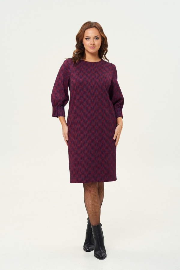 Платье прямого силуэта из трикотажной ткани. Перед с нагрудными вытачками из бокового шва. Спинка со средним швом, вверху шва обработан разрез с застежкой на петлю и пуговицу. Рукав одношовный втачной, по низу застрочены защипы. Длина спинки по среднему шву — 100см, длина рукава-45см.
