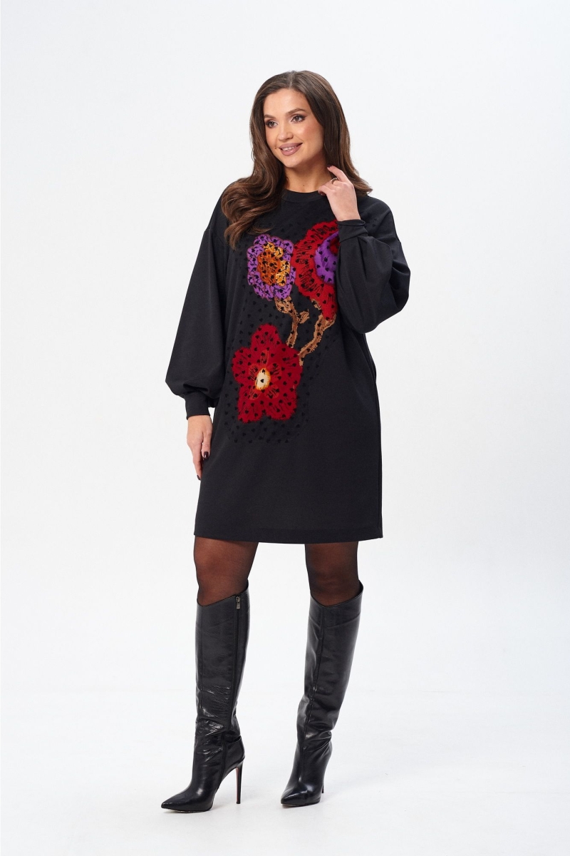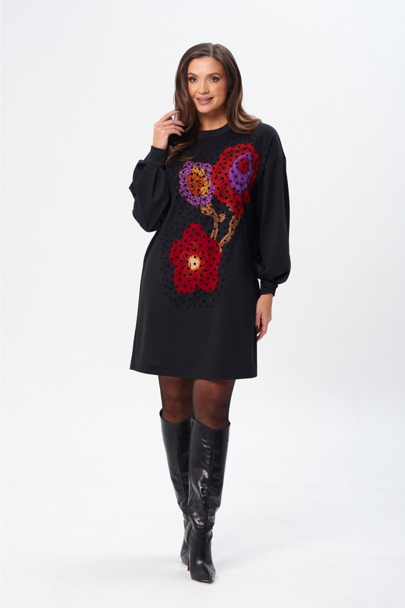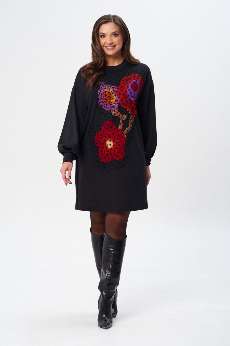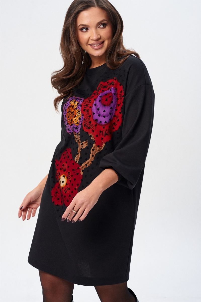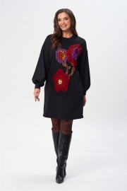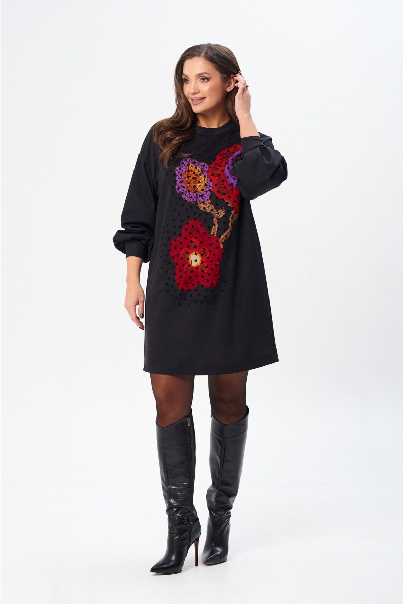 Платье (туника) свободного силуэта из трикотажной ткани с принтом. Рукав втачной одношовный со складками по низу и манжетой. Горловина обработана планкой. По переду поверх принта настрочена сетка. Сетка может быть заменена с сохранением художественного образа изделия. Длина платья - 93 см, длина рукава платья - 53 см.
