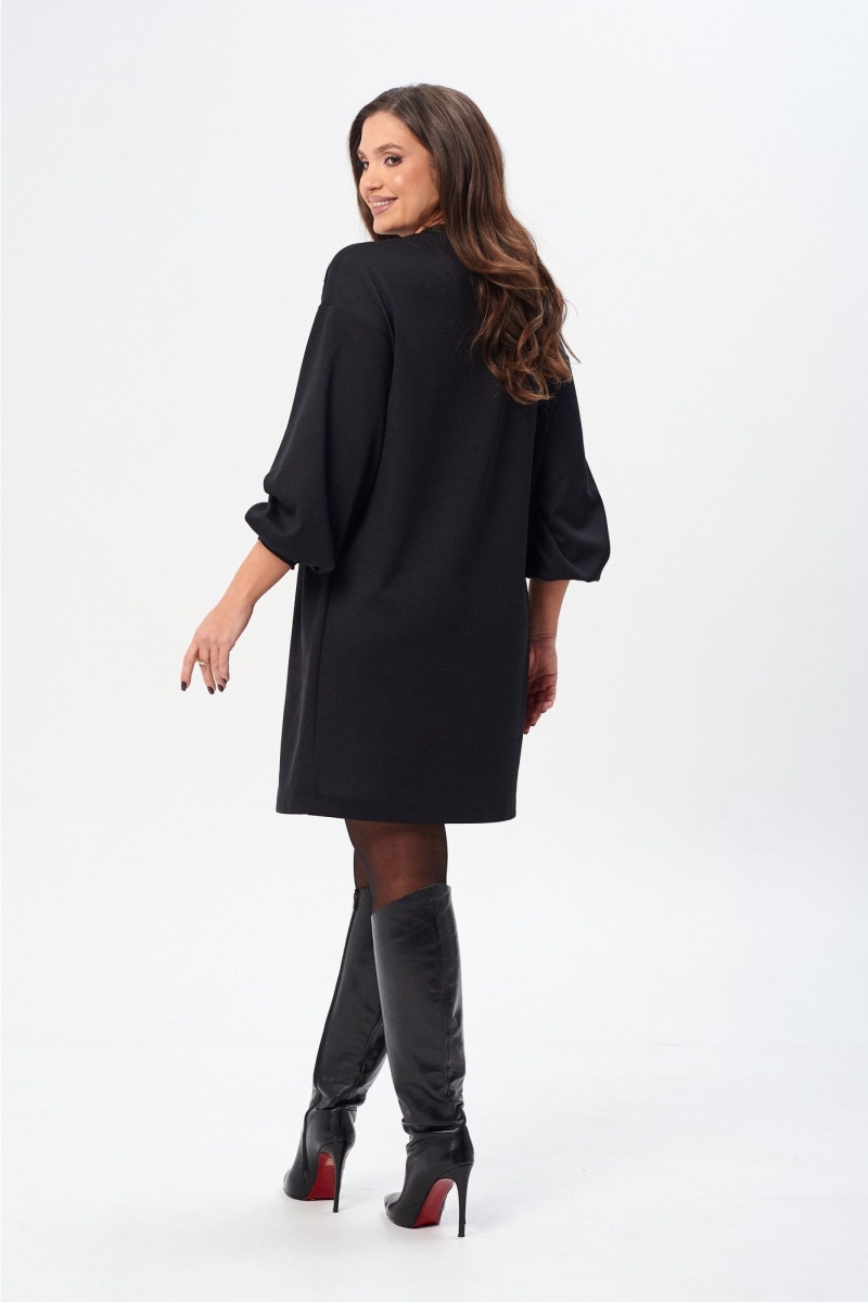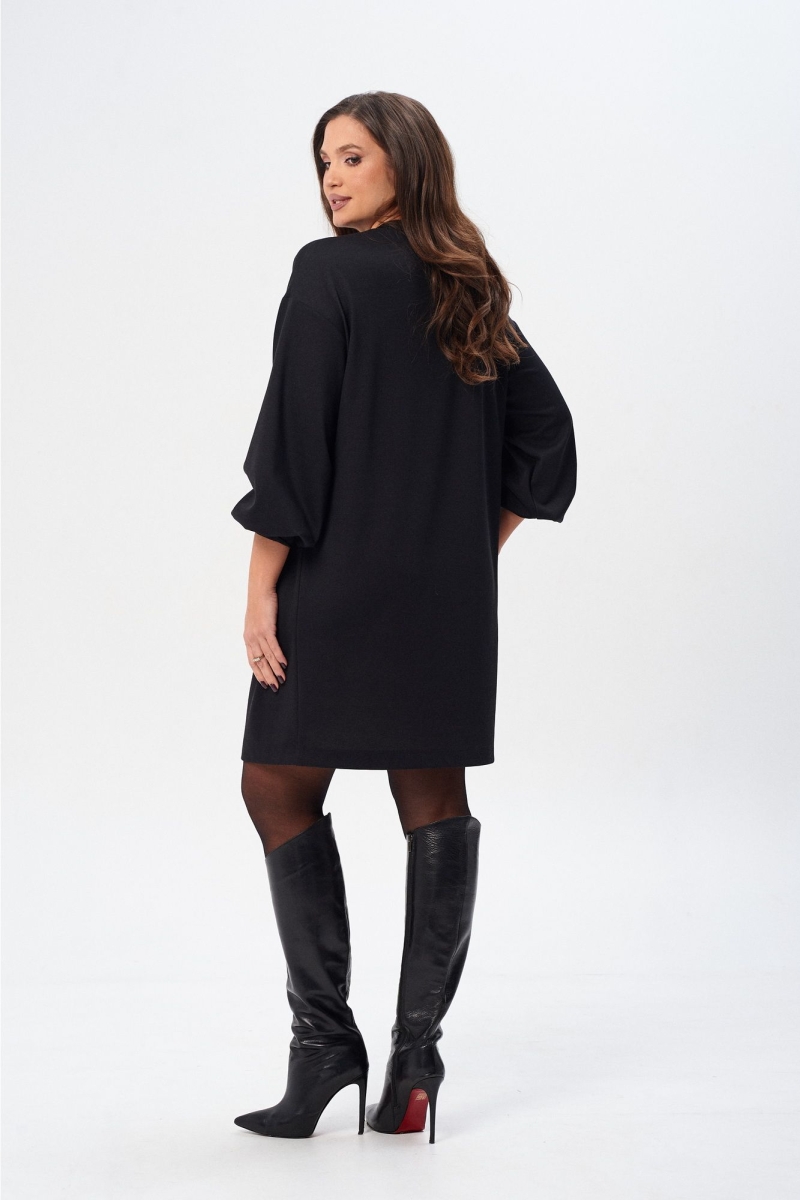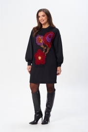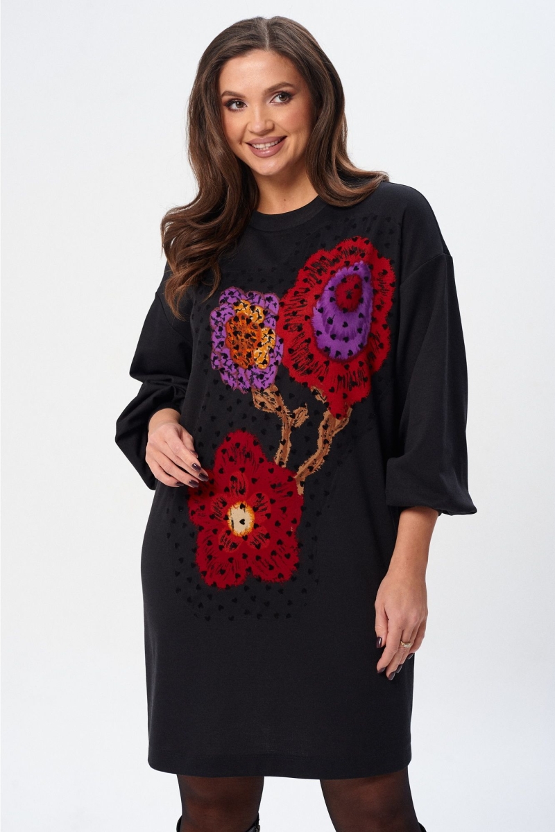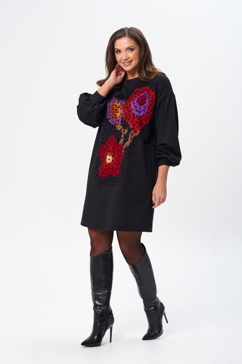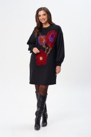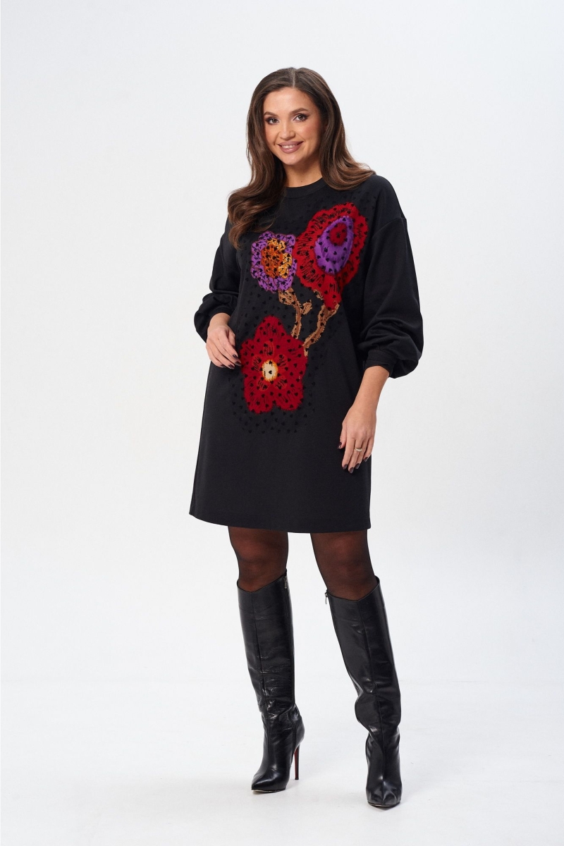 Платье (туника) свободного силуэта из трикотажной ткани с принтом. Рукав втачной одношовный со складками по низу и манжетой. Горловина обработана планкой. По переду поверх принта настрочена сетка. Сетка может быть заменена с сохранением художественного образа изделия. Длина платья - 93 см, длина рукава платья - 53 см.