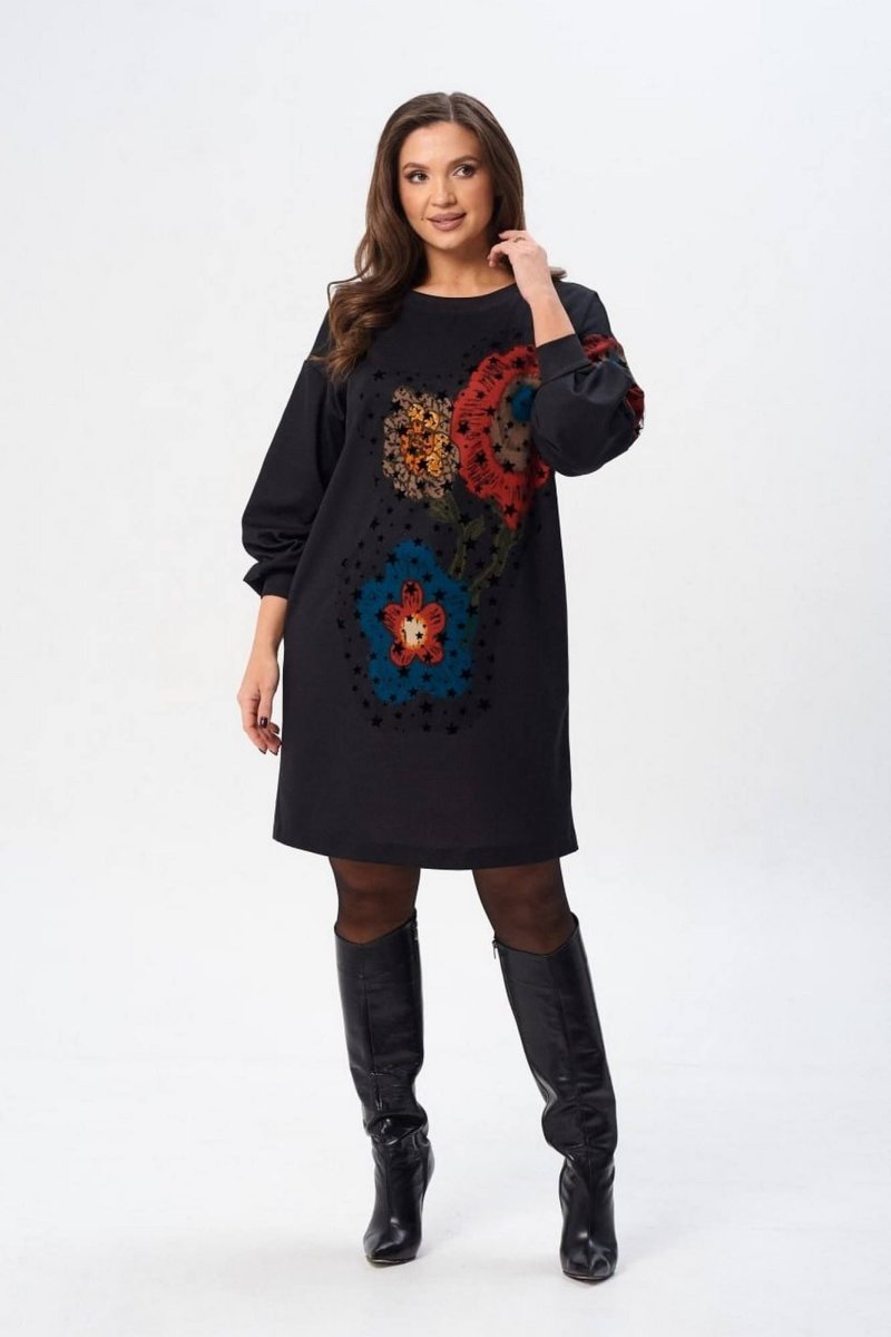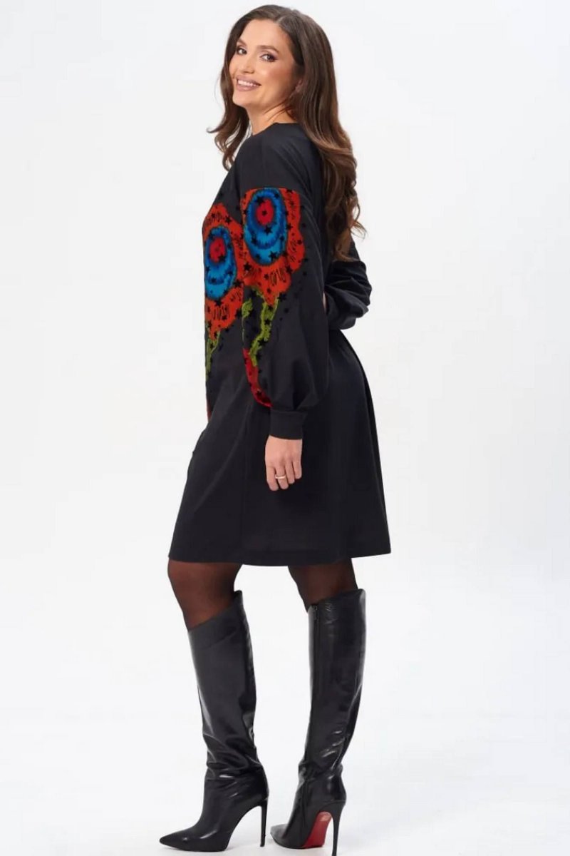 Платье свободного силуэта из трикотажной ткани с принтом. Рукав втачной одношовный со складками по низу и манжетой. В боковых швах карманы. Горловина обработана планкой в форме лодочки. По переду в в ерхней части настрочена сетка. Длина платья - 91 см , длина рукава платья - 53 см.