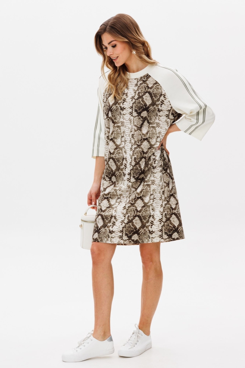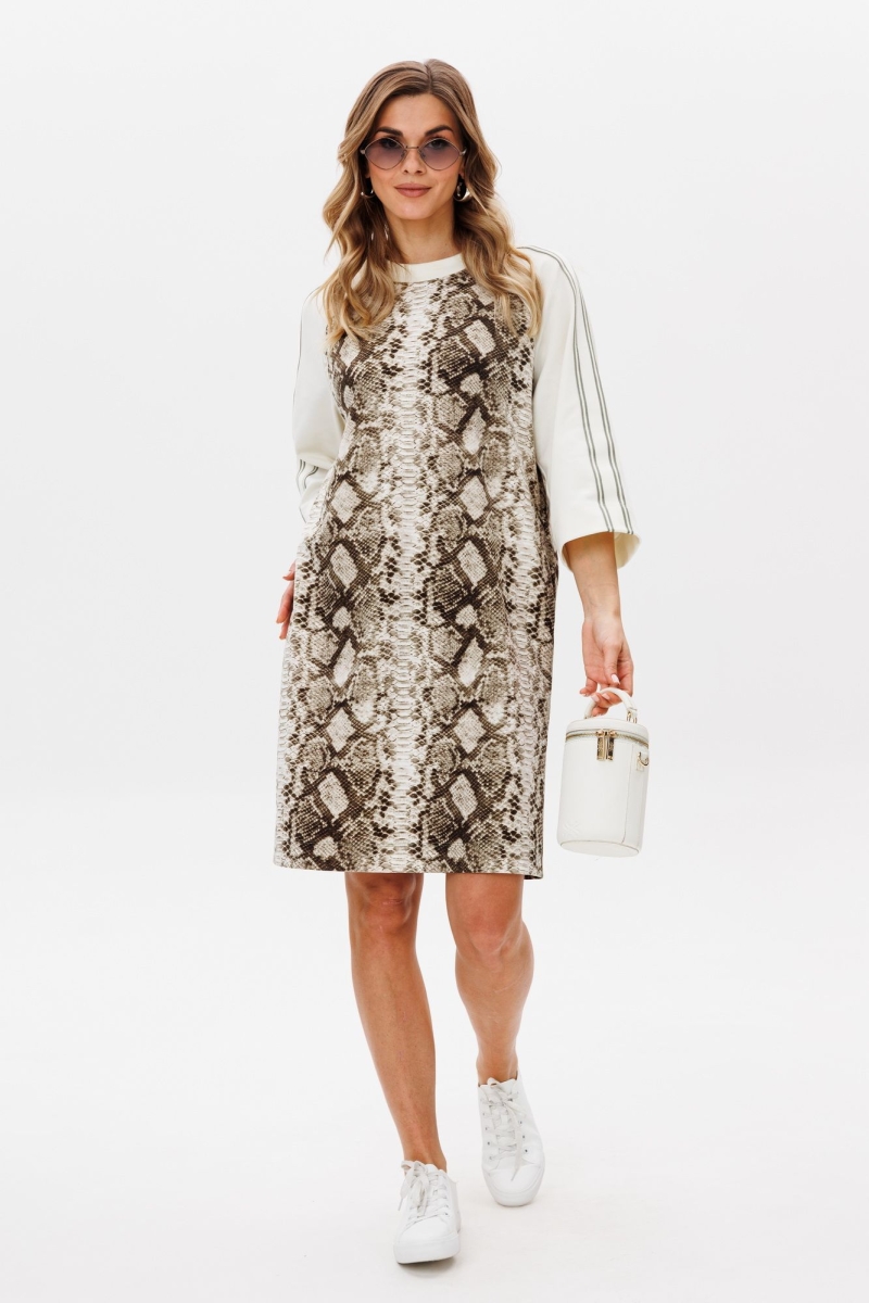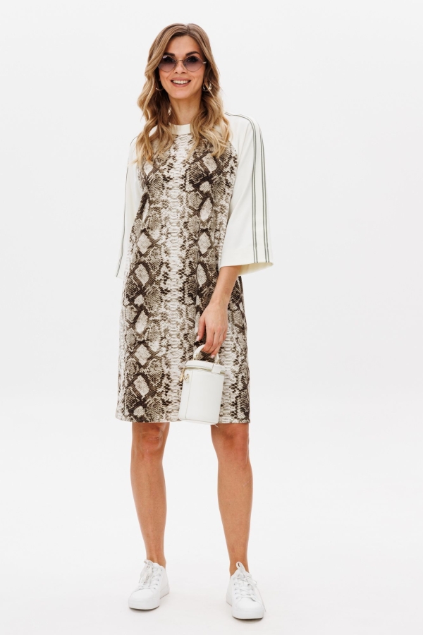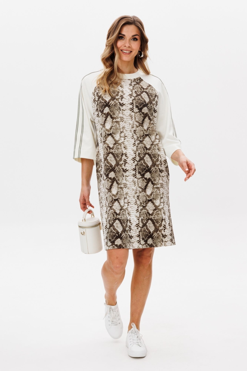 Платье прямого силуэта из трикотажной ткани с принтом. Рукав реглан с декоративной лампасом. Горловина округлой формы обработна планкой. Длина платья - 96 см, длина рукава платья - 54см.