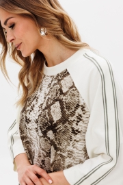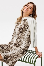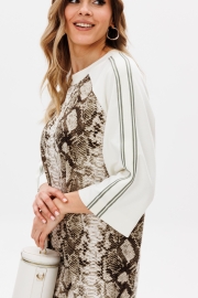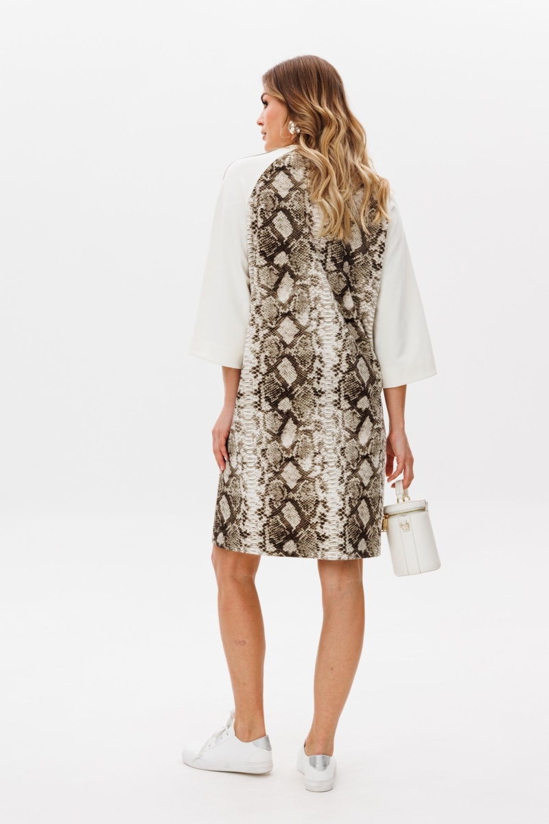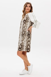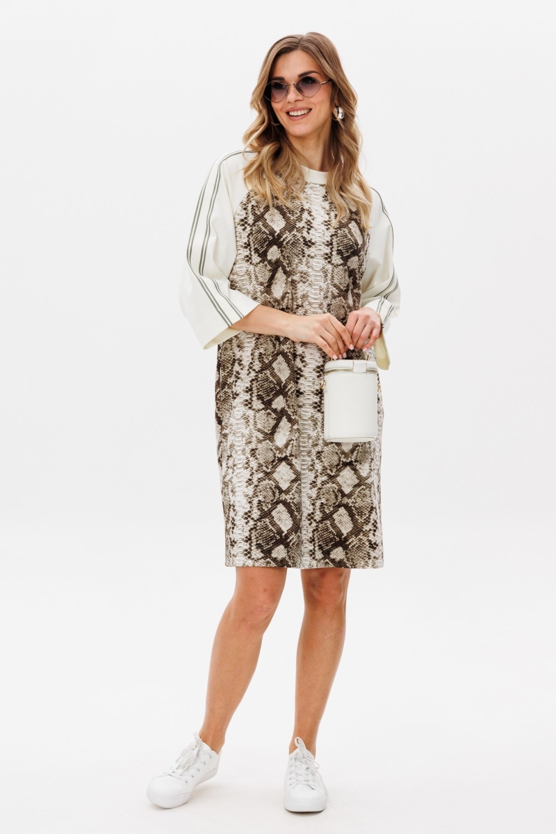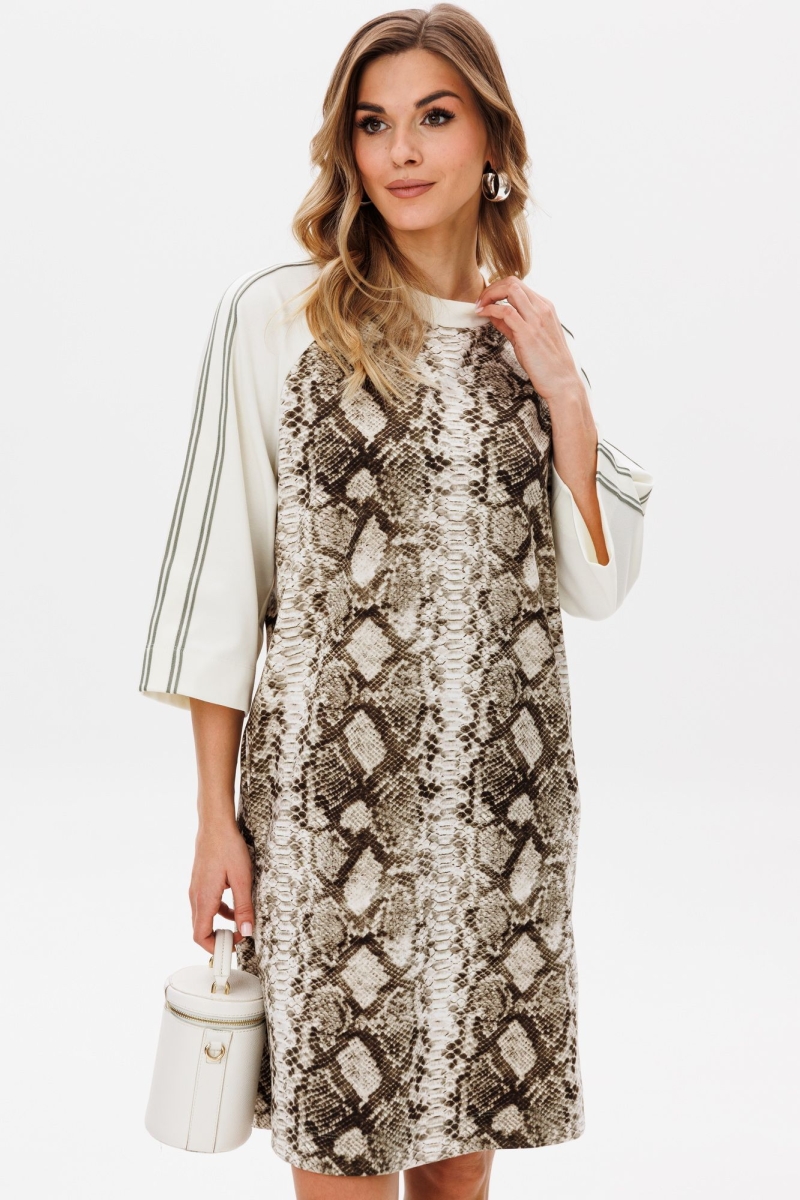 Платье прямого силуэта из трикотажной ткани с принтом. Рукав реглан с декоративной лампасом. Горловина округлой формы обработна планкой. Длина платья - 96 см, длина рукава платья - 54см.