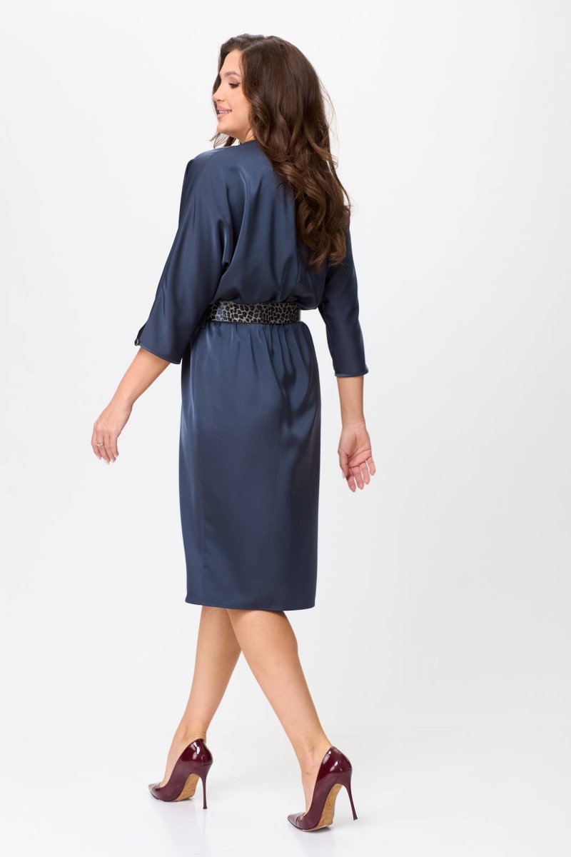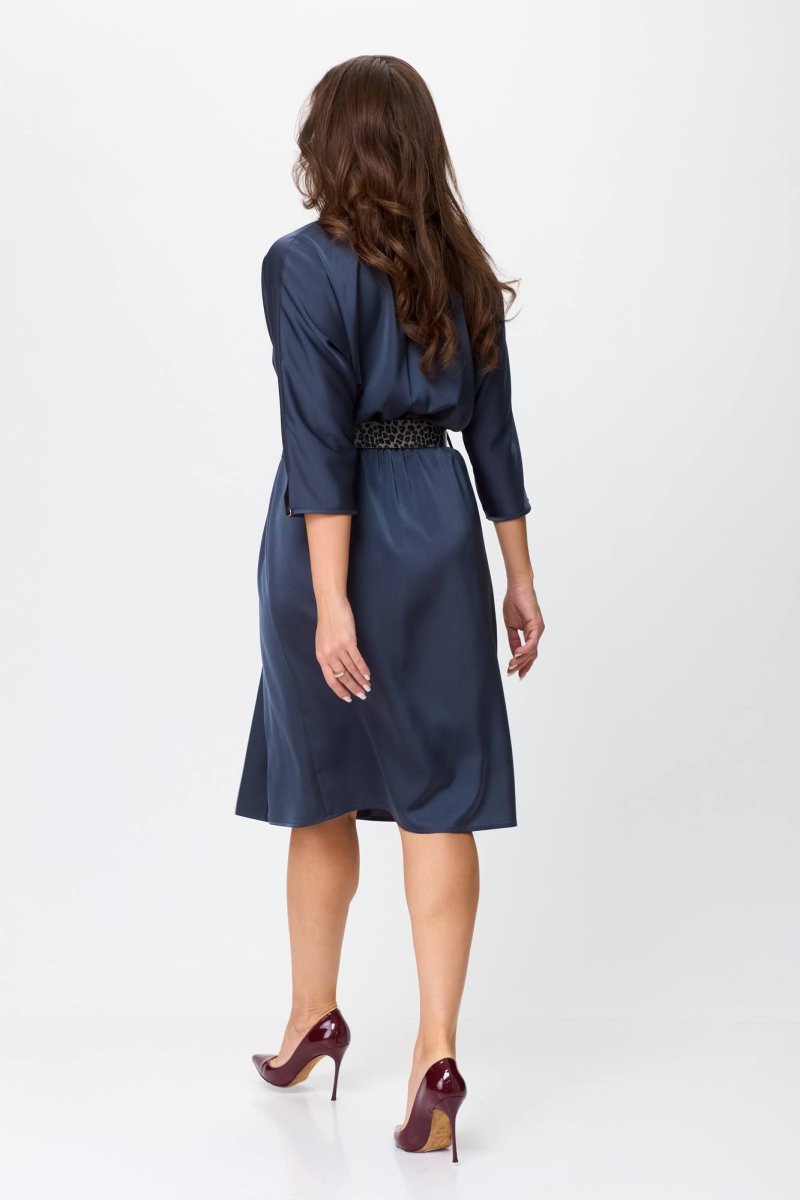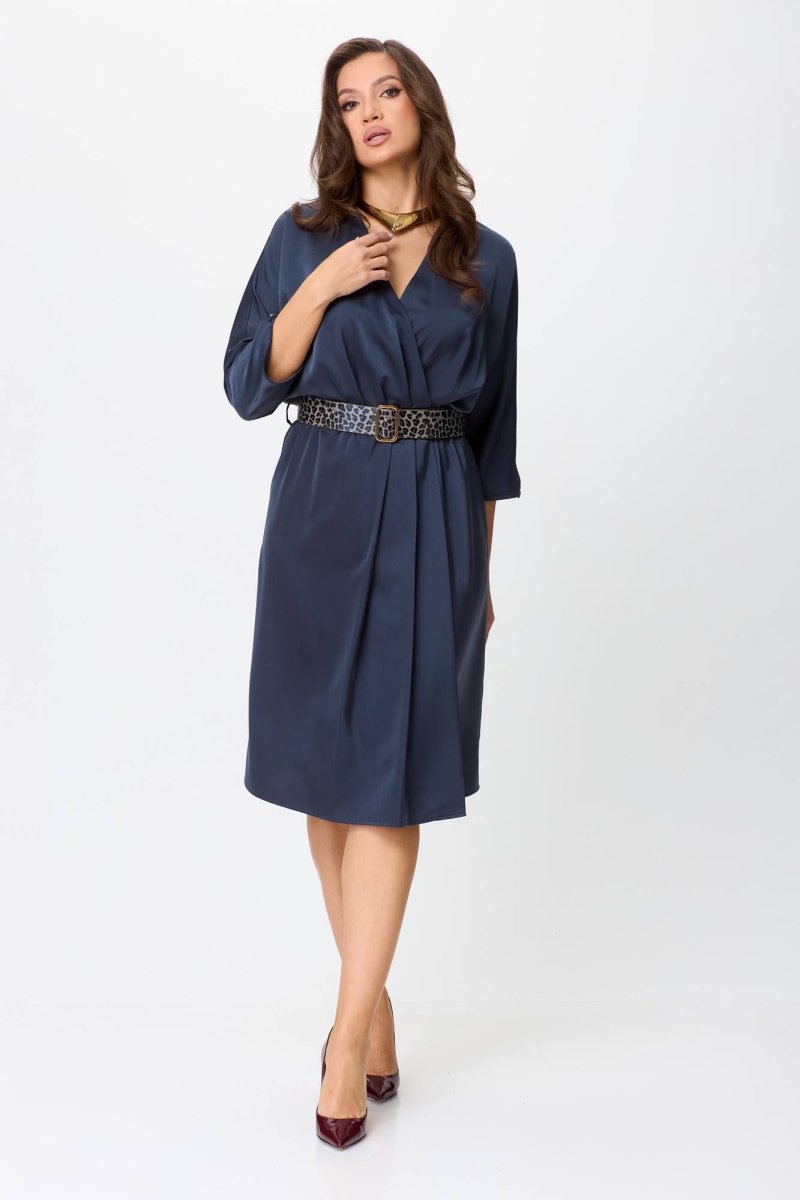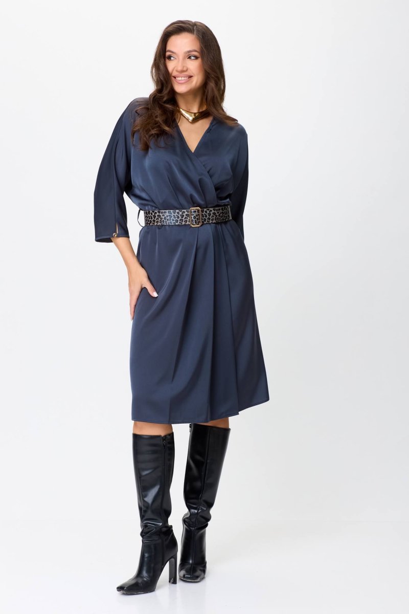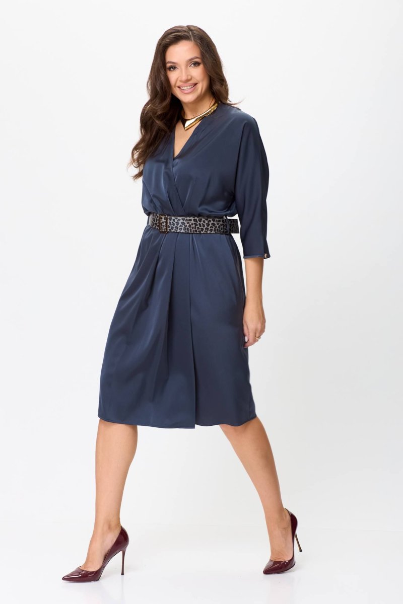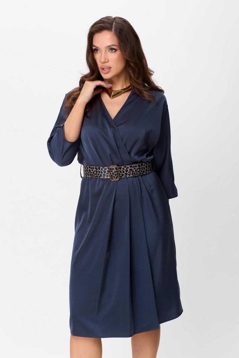 Платье женское из сатина с матовым блеском. Платье приталенного силуэта. Покрой рукава цельнокроеный. Платье отрезное по линии талии. Лиф платья имеет V образное декольте, детали переда ""на запах "", заложены несколько неглубоких складок. Нагрудных выточек нет. Внизу рукава небольшой разрез и декоративная пуговичка. Юбка платья так же выполнена ""на запах"" , на верхнем полотнище заложены несколько складок. Застёжки нет. Карманы в боковых швах. Лиф спинки со средним швом. Спинка юбки без шва. Платье без подкладки. Ремень в комплекте. Фурнитура может быть заменена на аналогичную с сохранением художественного образа модели.