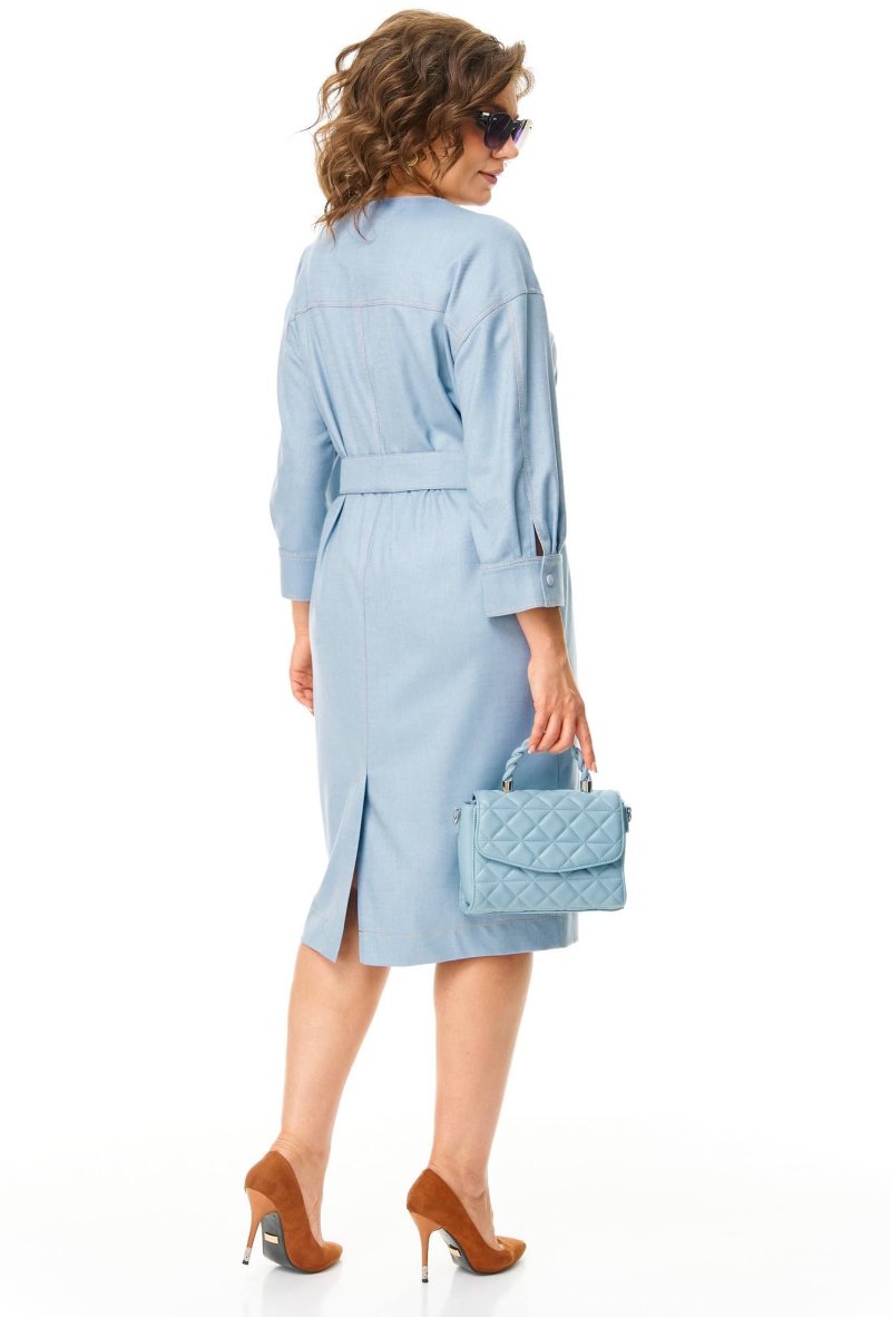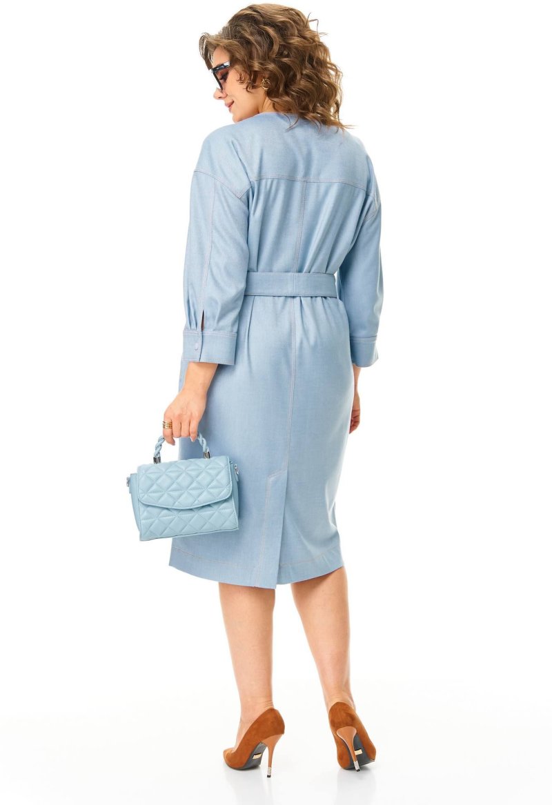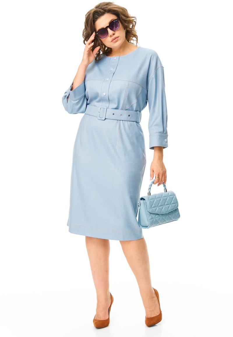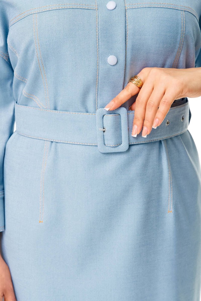Платье выполнено из мягкой плательной ткани с джинсовой фактурой. Силуэт прямой, линия плеча спущена. По переду горизонтальный подрез и полурельефы, отстрочены контрастной отделкой. Горловина овальная, застёжка планка на кнопки. Низ рукава обработан манжетой. Карманы в боковых швах. Спинка аналогичная переду. Платье без подкладки. Съёмный пояс из основного полотна в комплекте.
