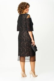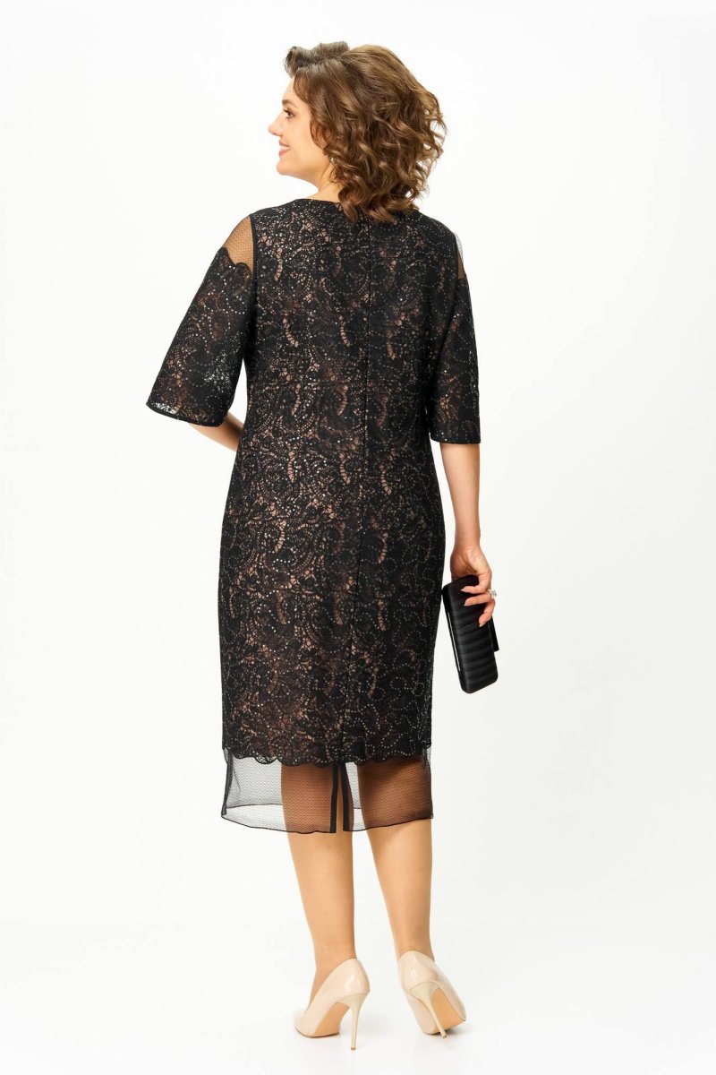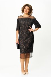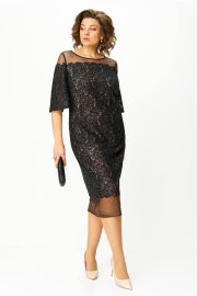 Платье нарядное, выполнено из кружевного полотна с пайетками. Силуэт полуприлегающий , рукав втачной. Рукав чуть расширен к низу. Горловина овальная. Кружевное полотно имеет фигурный край который заканчивается гипюровой сеткой внизу. Спинка со средним швом, застёжка на потайную молнию. Внизу по среднему шву разрез для хода. Платье на подкладке.
